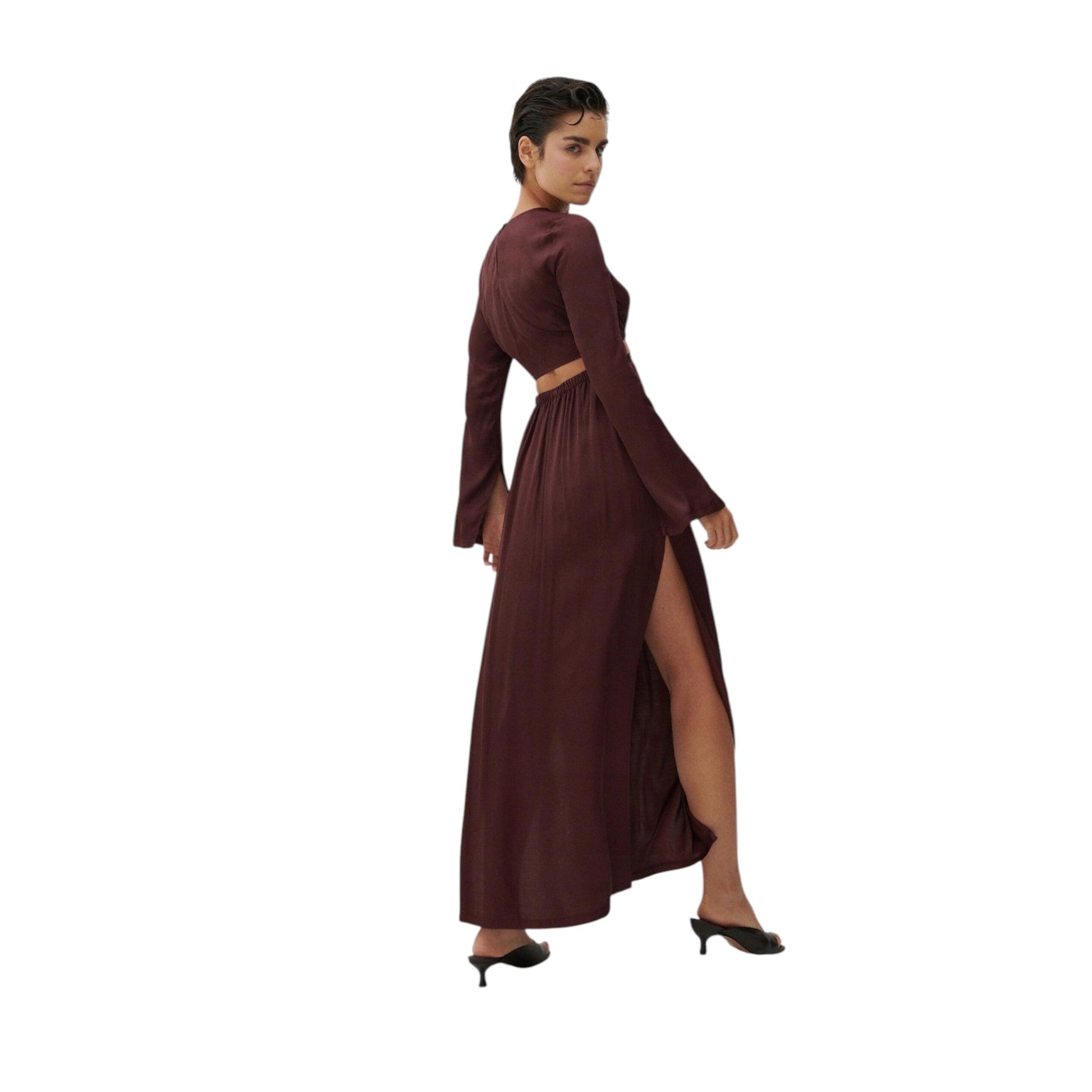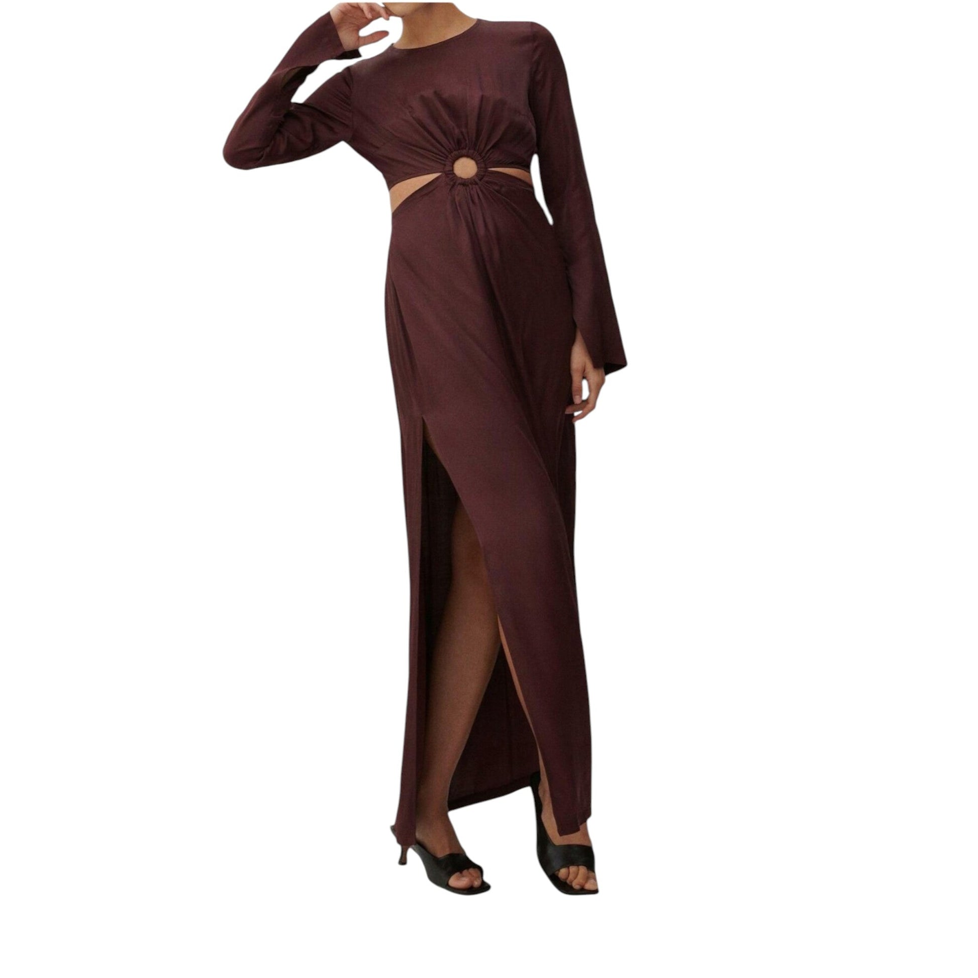 Címke nélküli, barna, selyem hatású anyagú, hosszú ujjú, maxi fazon, magas slicc az egyik oldalon, kivágás a derék részen körgyűrű díszítéssel, kerek nyakú, ruha.