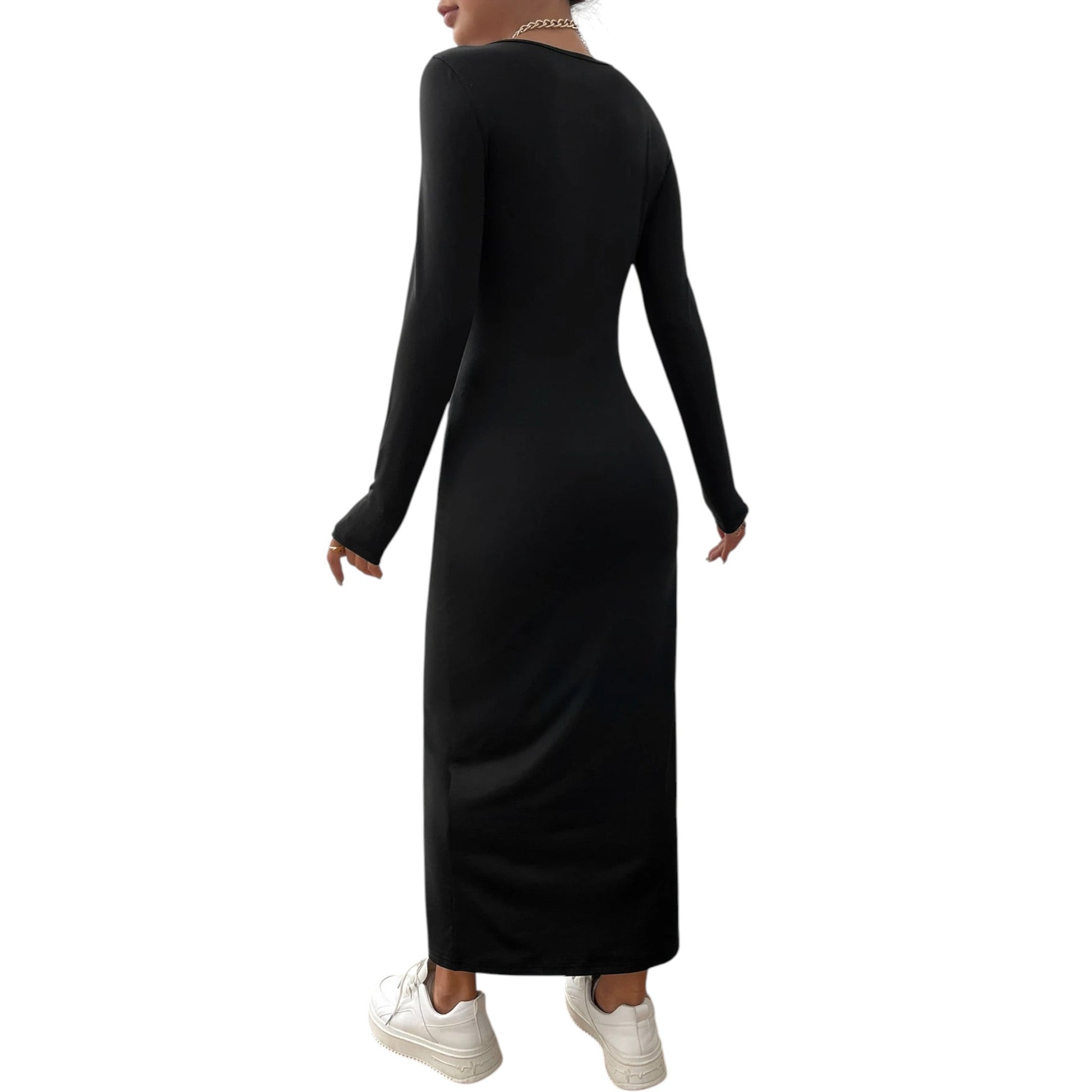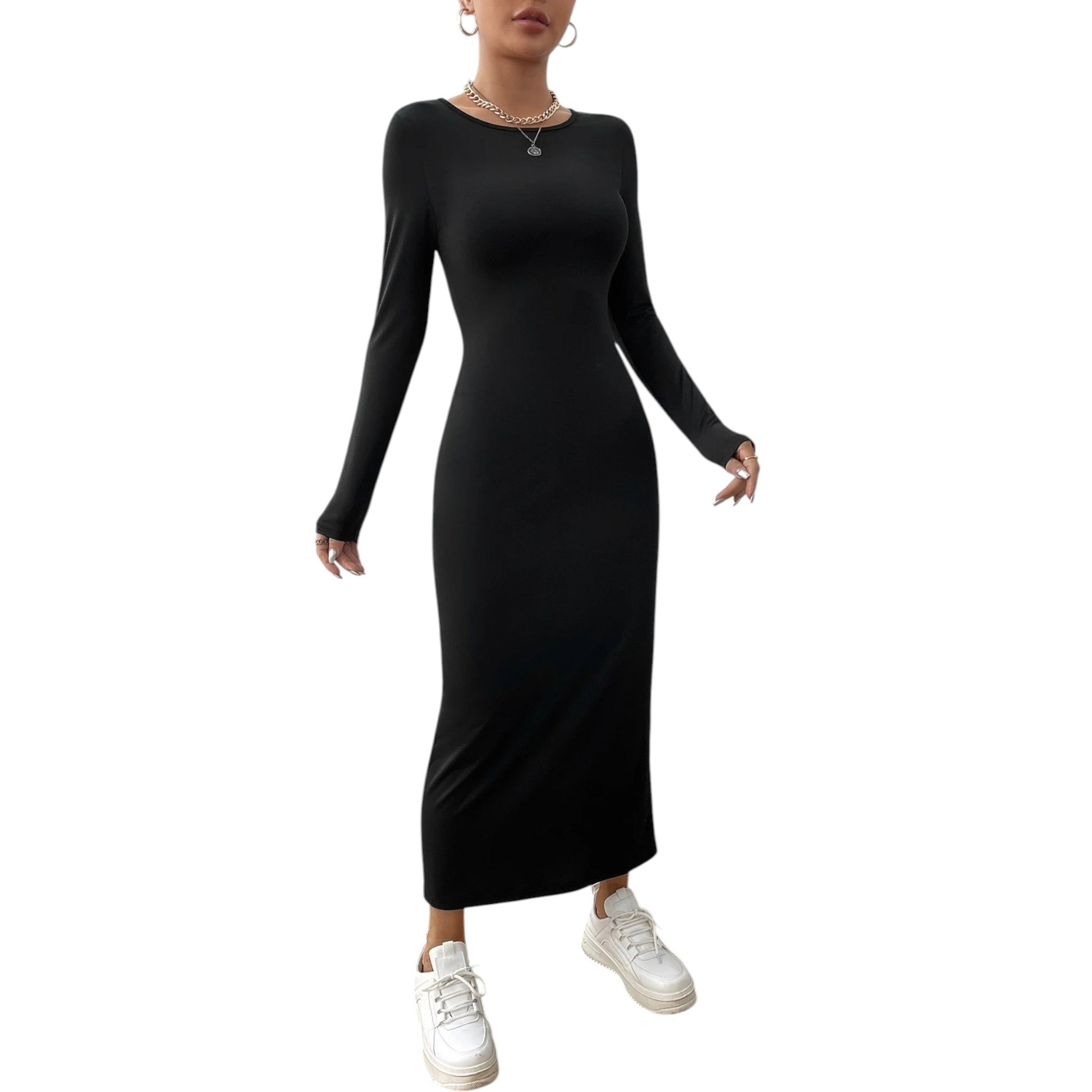 Címke nélküli, fekete, hosszú ujjú, kerek nyakú, testhezálló midi ruha, oldalsó sliccel.