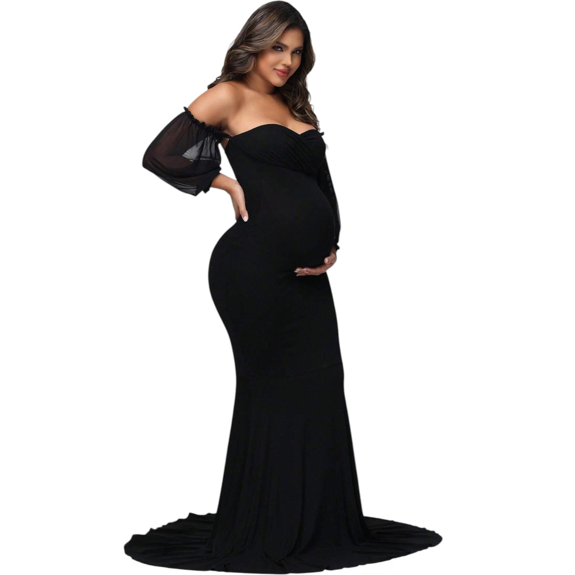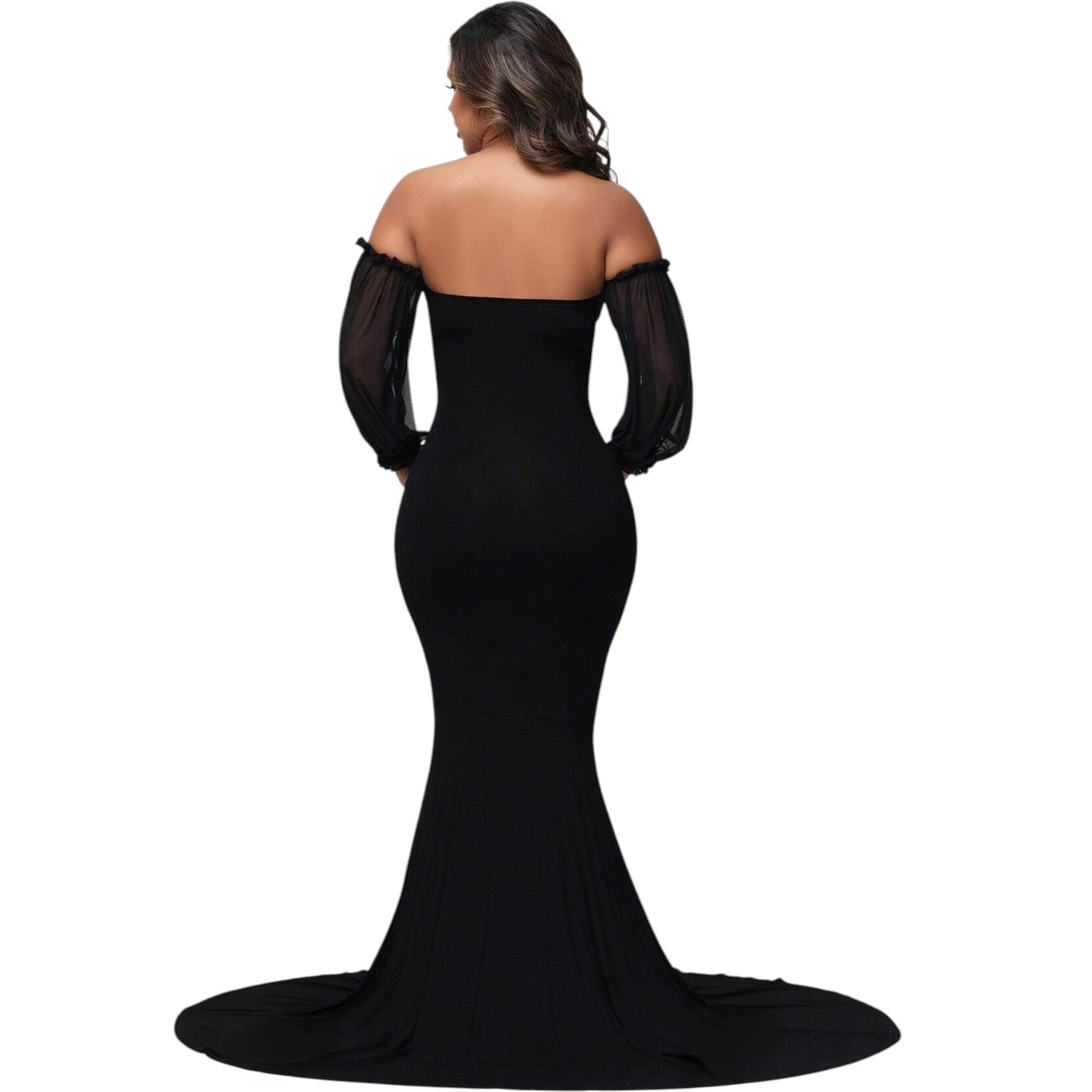 Címke nélküli, fekete, váll nélküli, hosszú áttetsző ujjú, testhezálló felsőrész, bővülő alj, földig érő hossz.