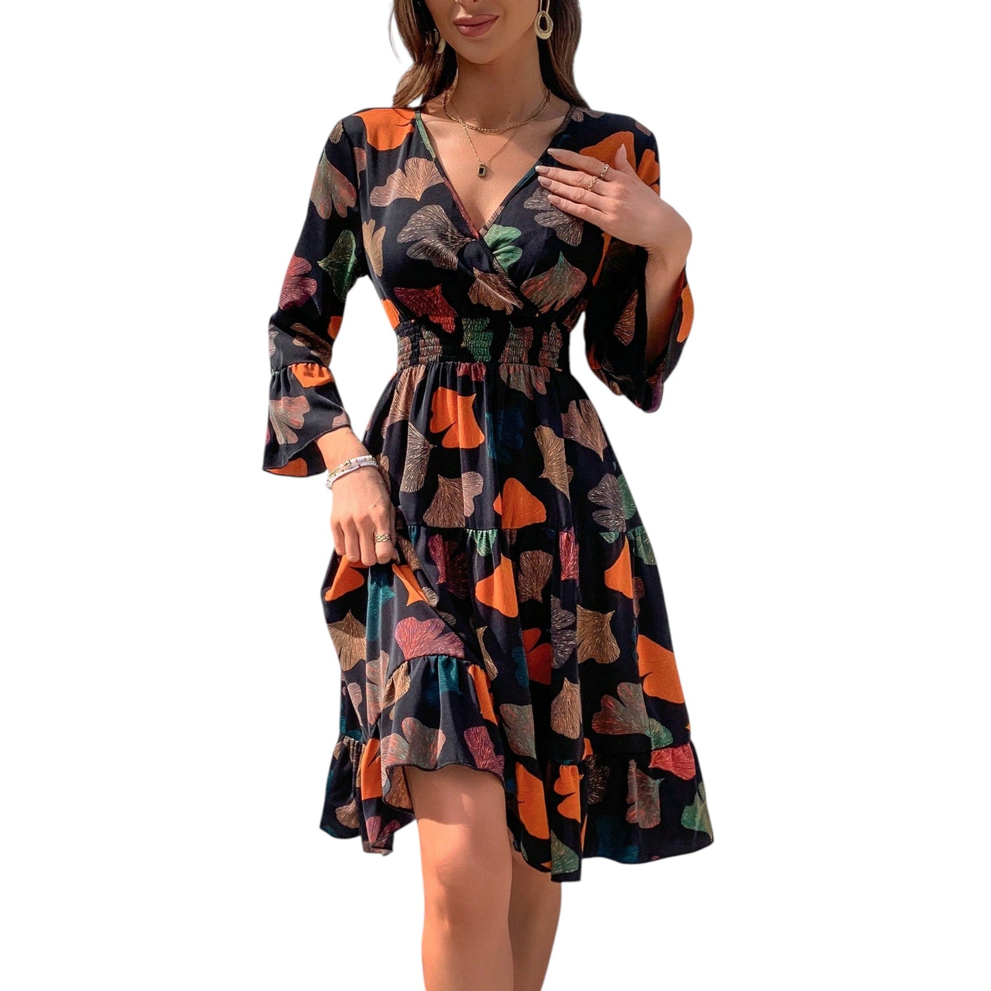 Címke nélküli, többszínű (levél mintás), V-nyakú, hosszú ujjú, ráncolt derékrésszel, réteges, fodros szoknyarész, mini ruha.