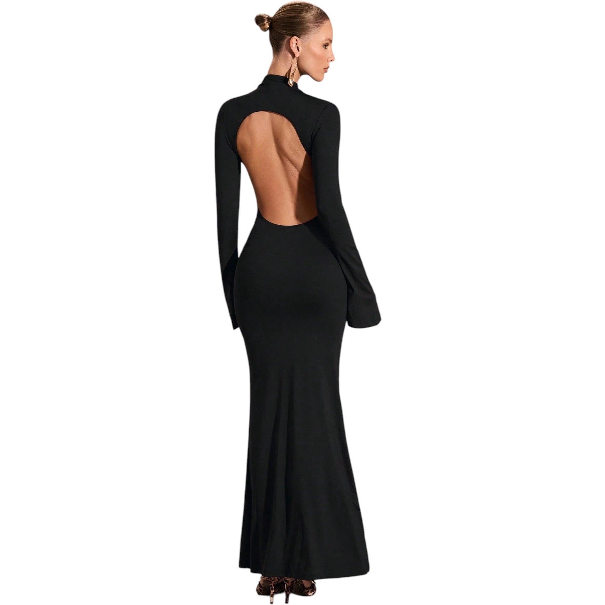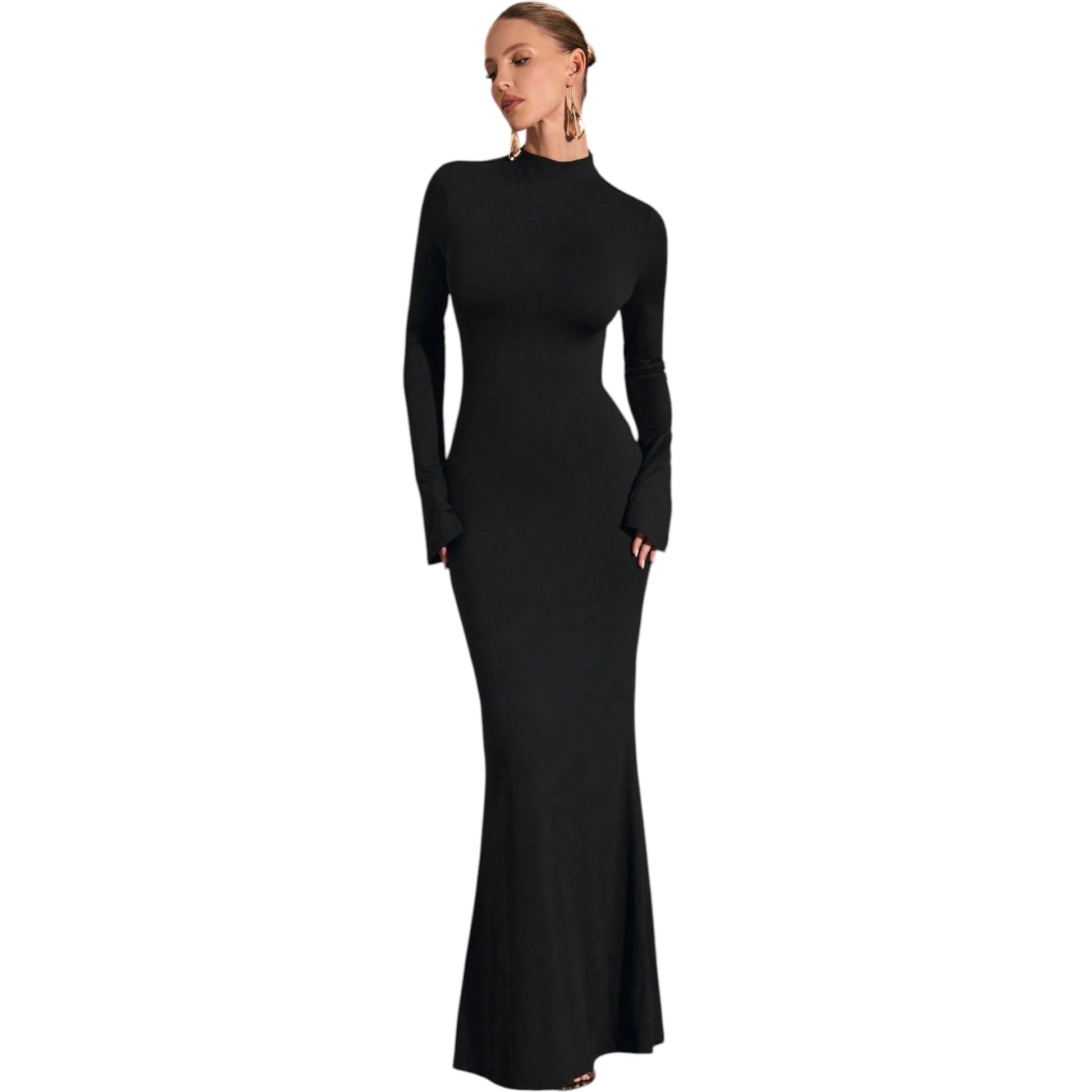 Címke nélküli, fekete, garbó nyakú, hosszú ujjú, testhezálló maxi ruha, enyhén bővülő aljjal.