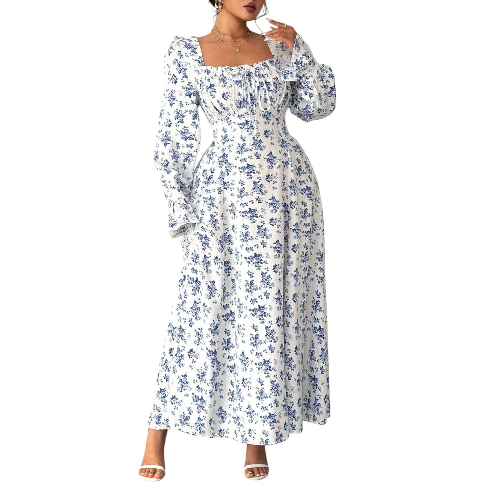 Címke nélküli, fehér alapon kék virág mintás, hosszú ujjú, négyzet alakú nyakkivágással, húzott mellrésszel, hosszú, bő szoknyával.