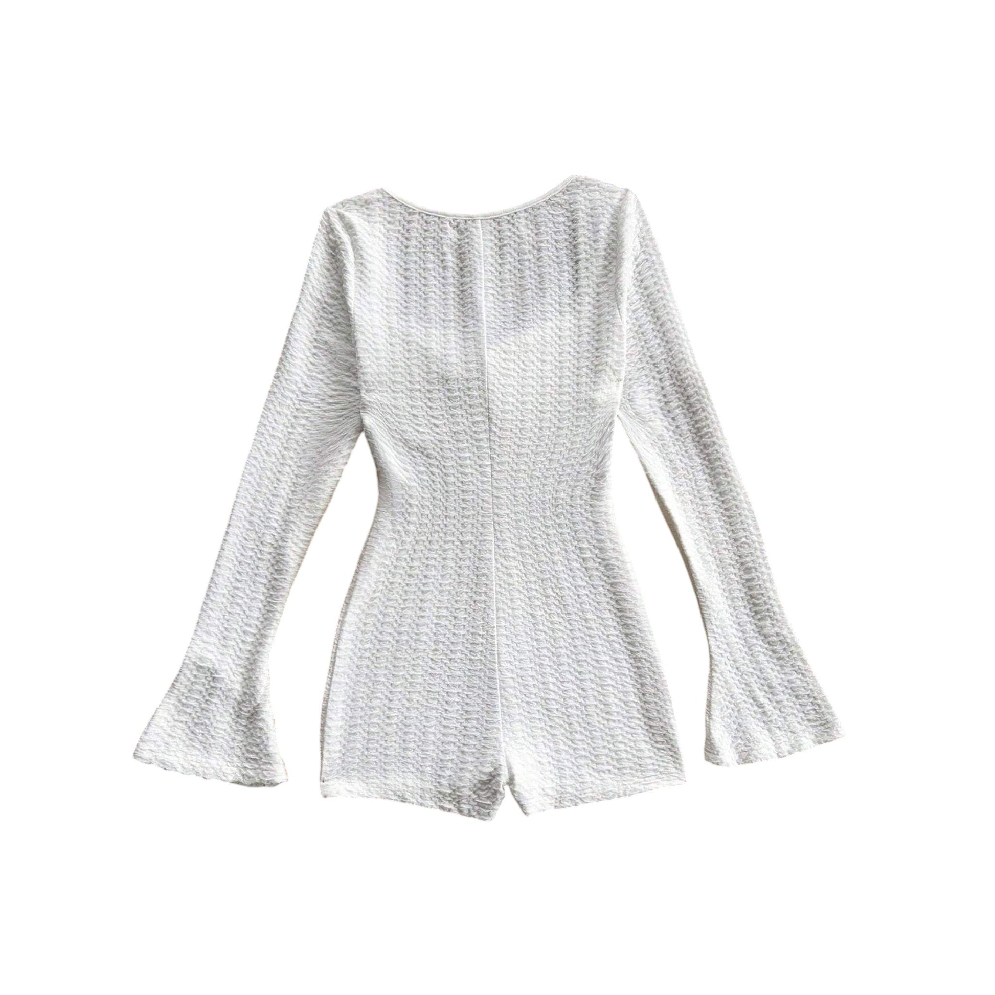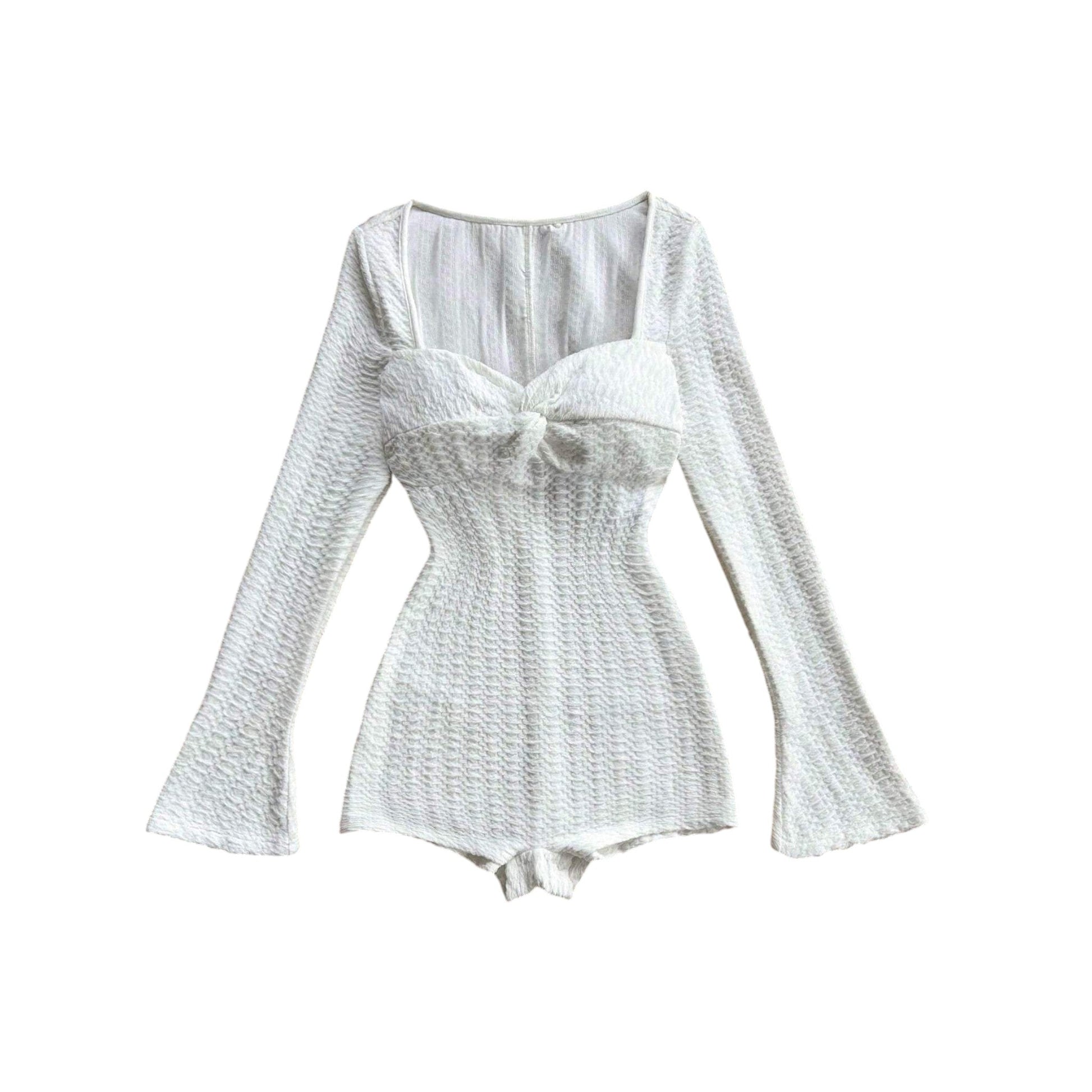 Címke nélküli, fehér, mintás, hosszú ujjú, négyzetes nyakkivágású, elöl megkötős, testhezálló playsuit.