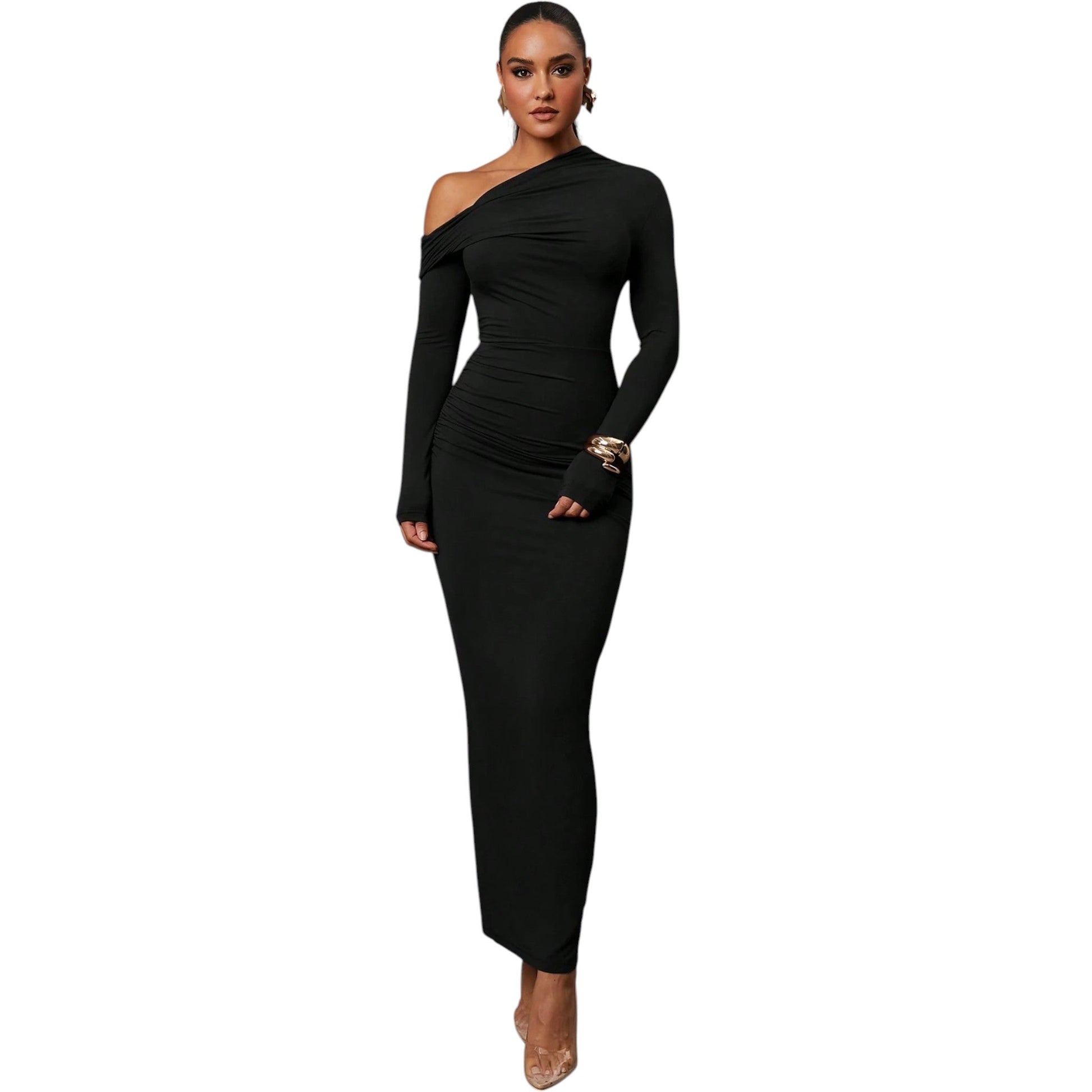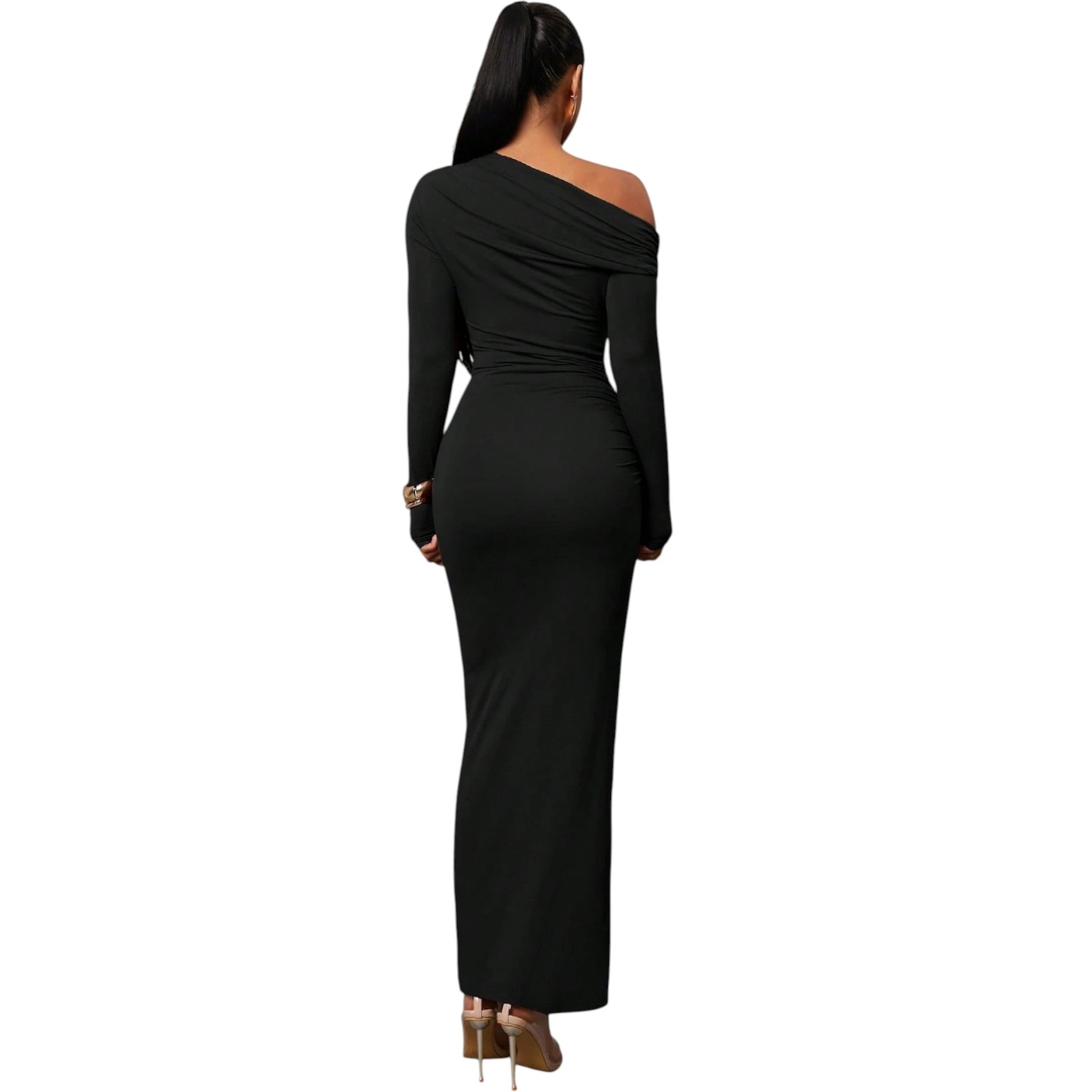 Címke nélküli, fekete, hosszú ujjú, félvállas maxi ruha, drappírozott részletekkel.