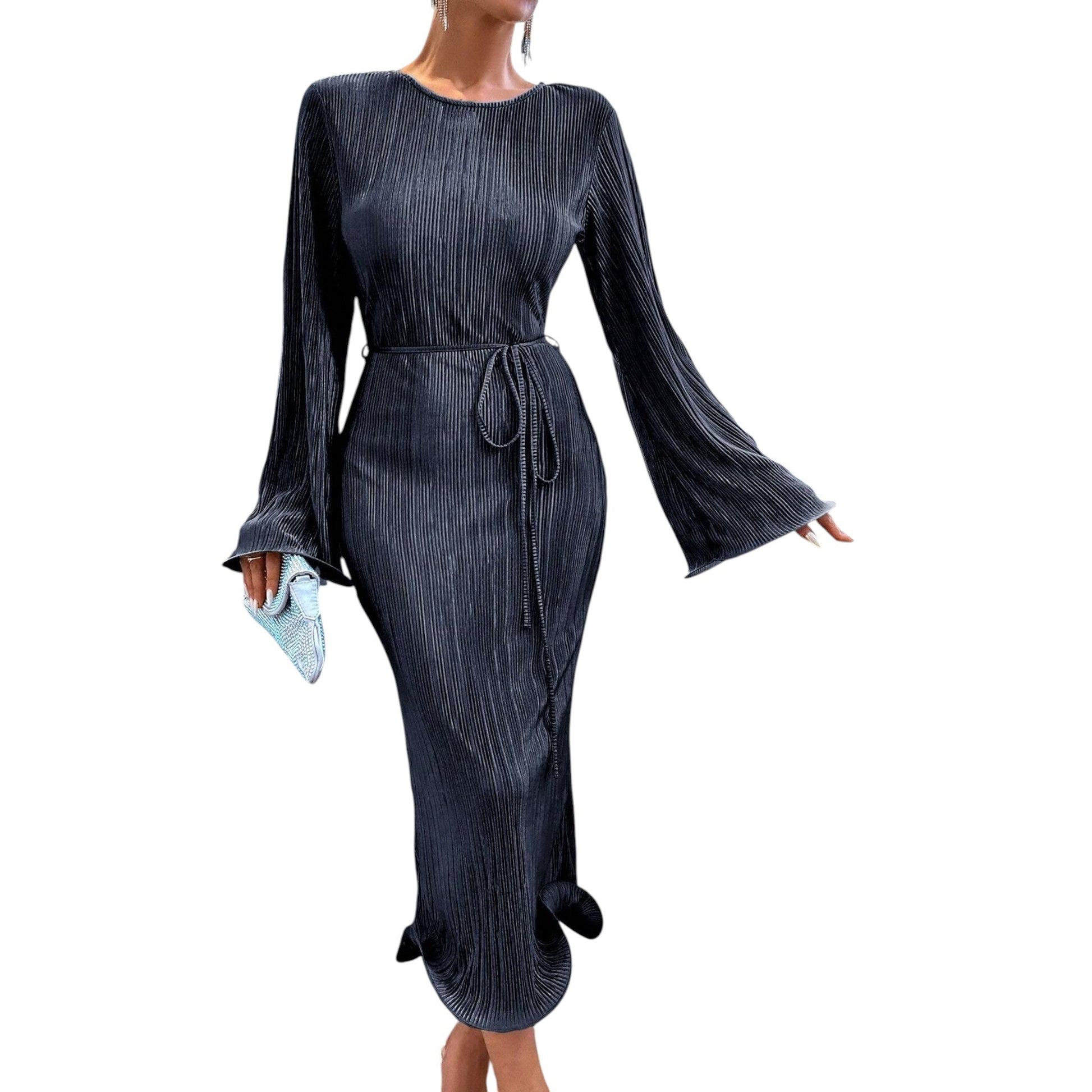 Címke nélküli, sötétkék, hosszú ujjú, kerek nyakú, pliszírozott, maxi hosszúságú.