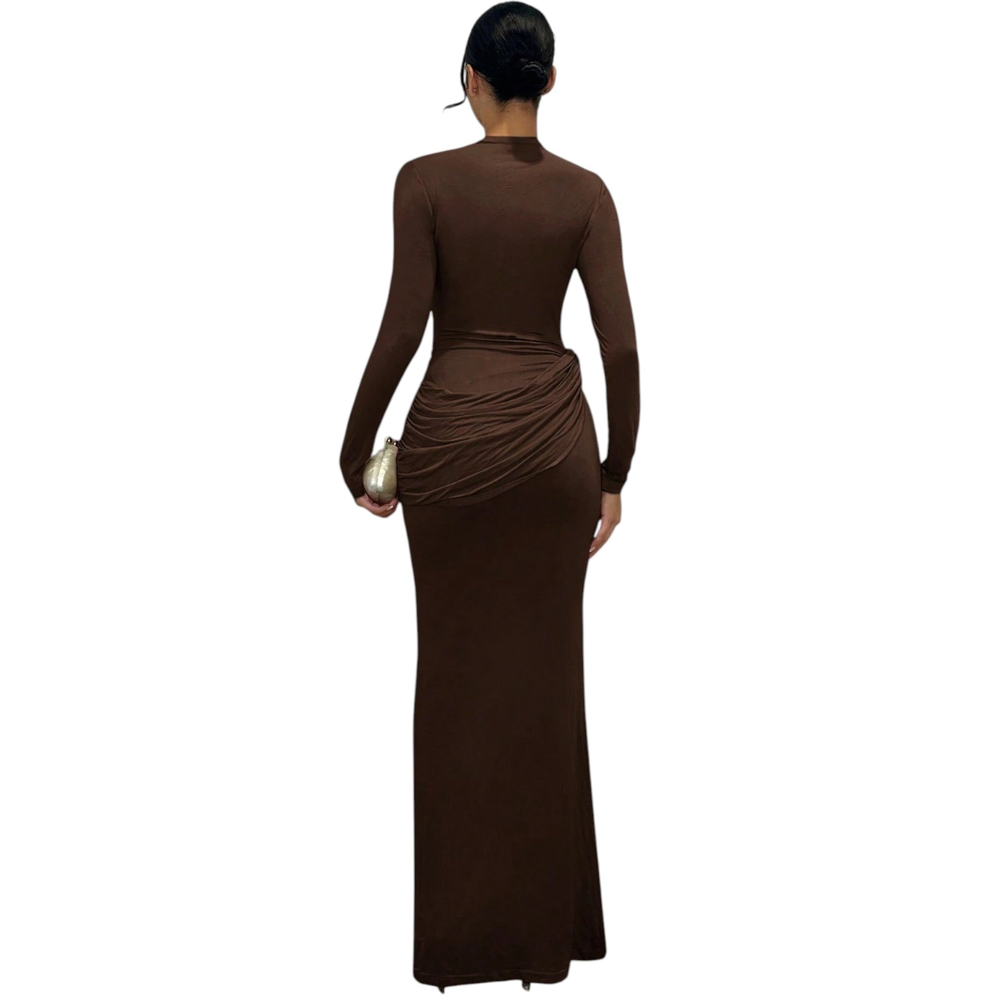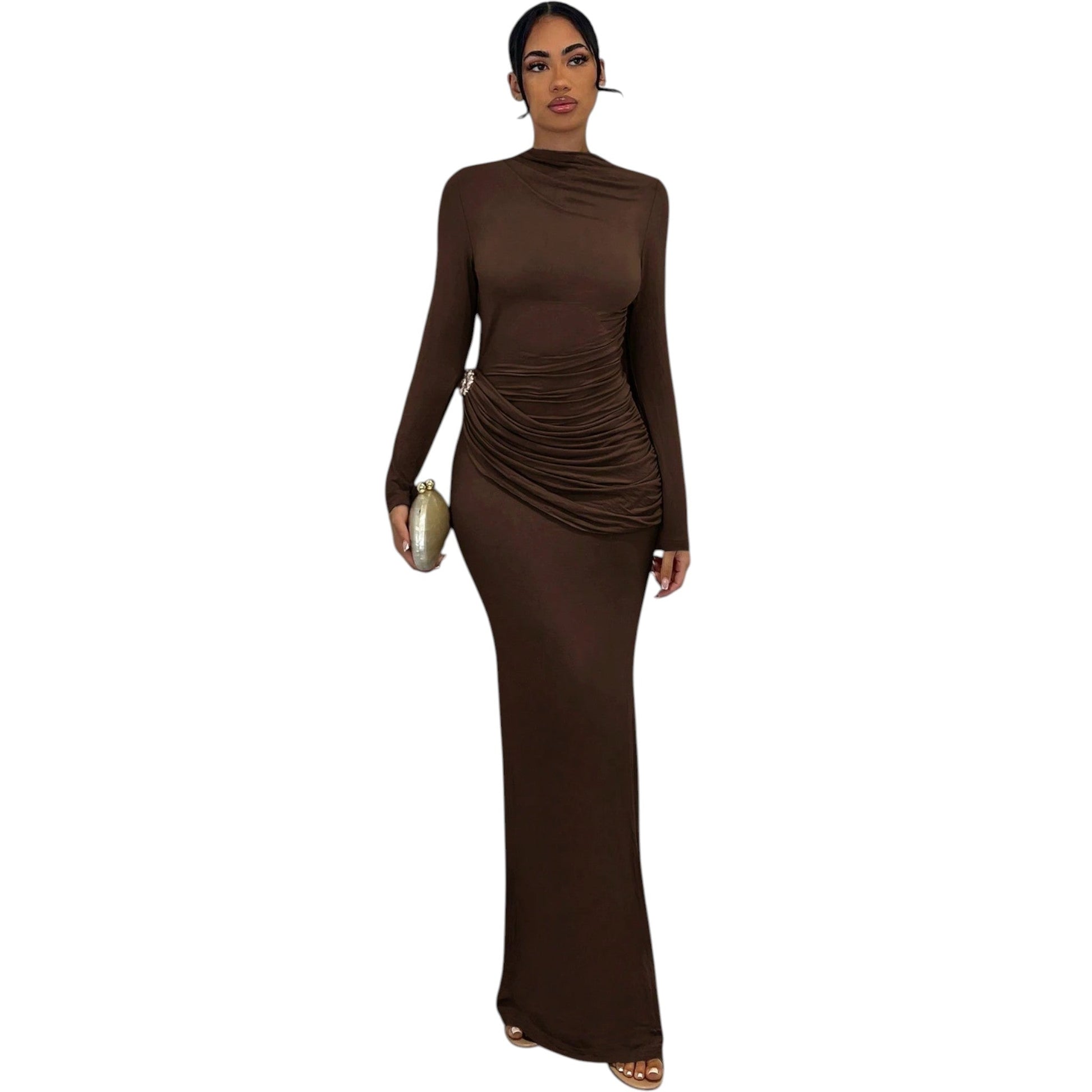 Címke nélküli, barna, hosszú ujjú, magas nyakú maxi ruha, drappírozott részletekkel.