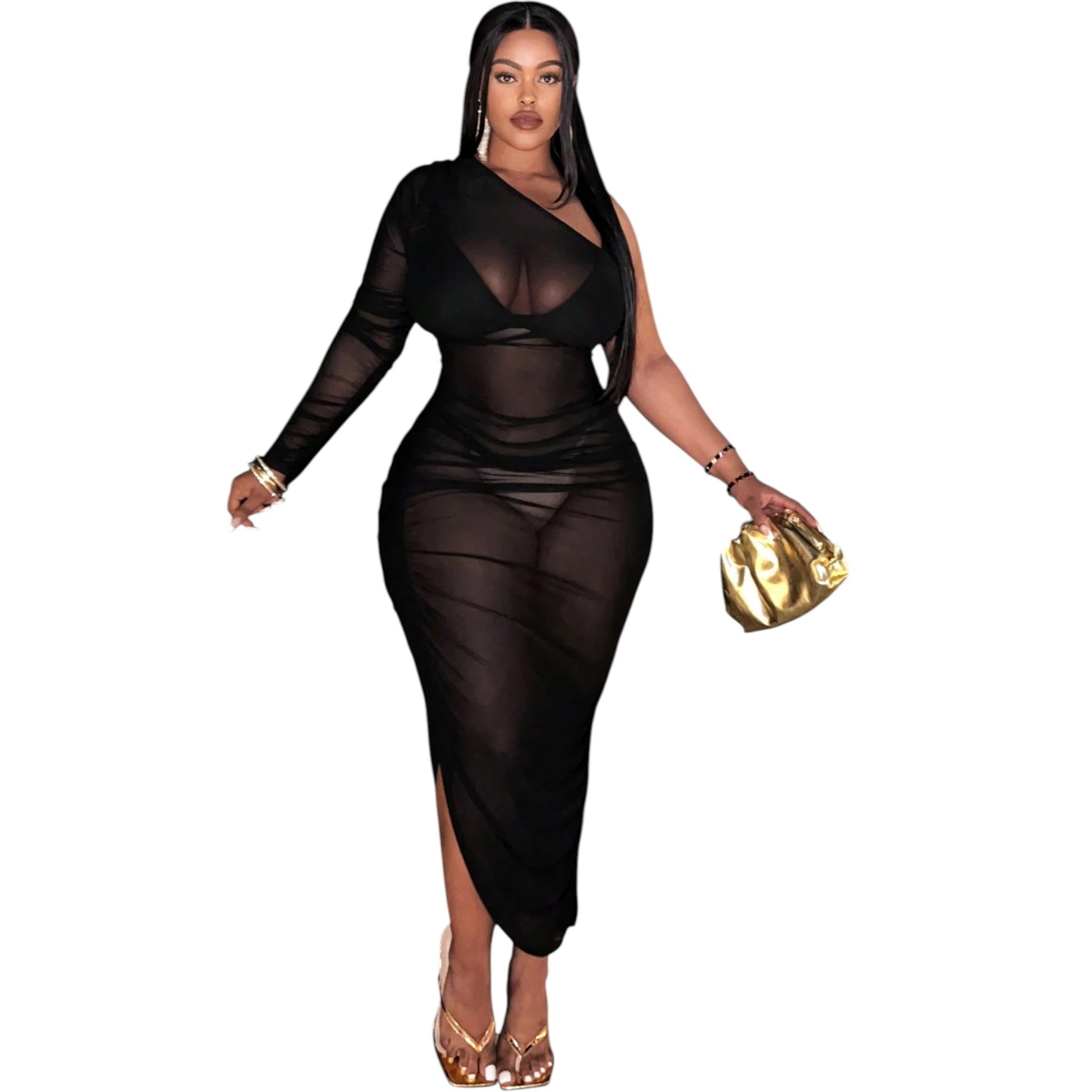 Címke nélküli, fekete, áttetsző, egy vállpántos, hosszú ujjú, oldalt felsliccelt, maxi ruha.