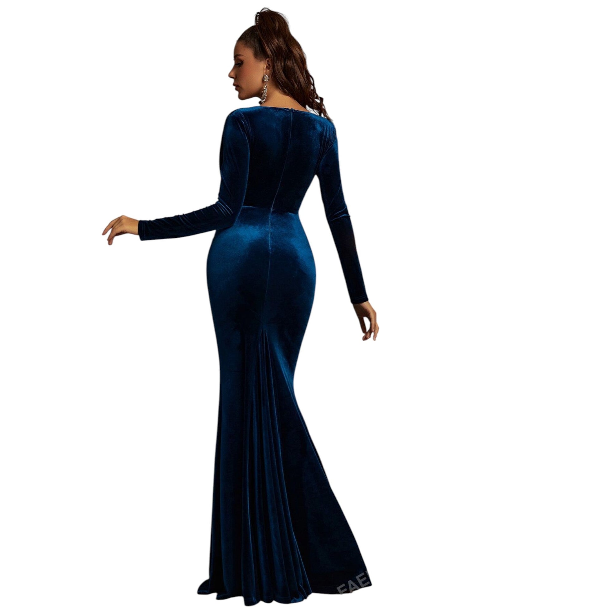 Címke nélküli, tengerészkék, bársony, hosszú ujjú, mély V-nyakú, hosszú, testhezálló maxi ruha.