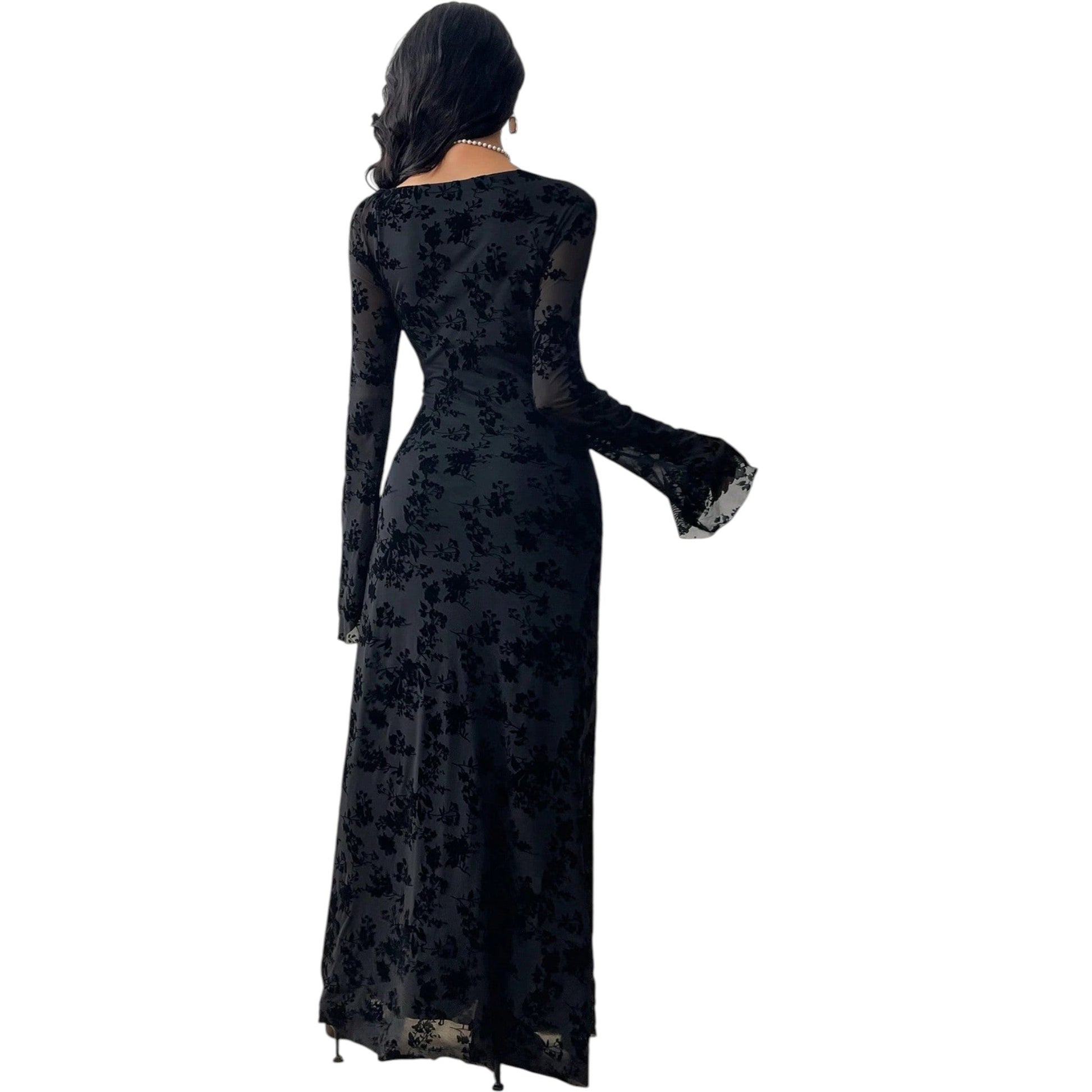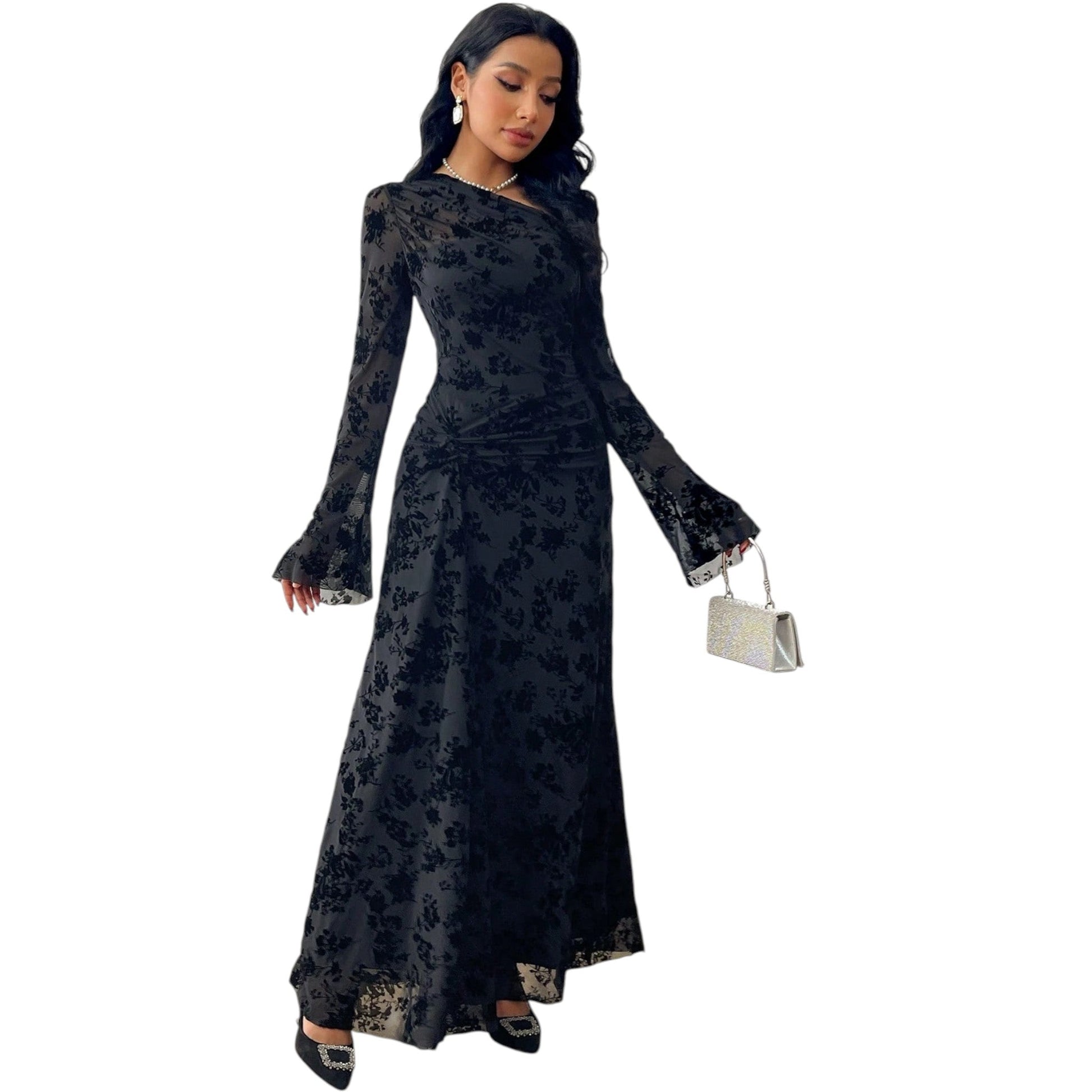 Címke nélküli, fekete, virágmintás, aszimmetrikus nyakú, harangujjú, ruched derékrész, maxi hosszúságú.