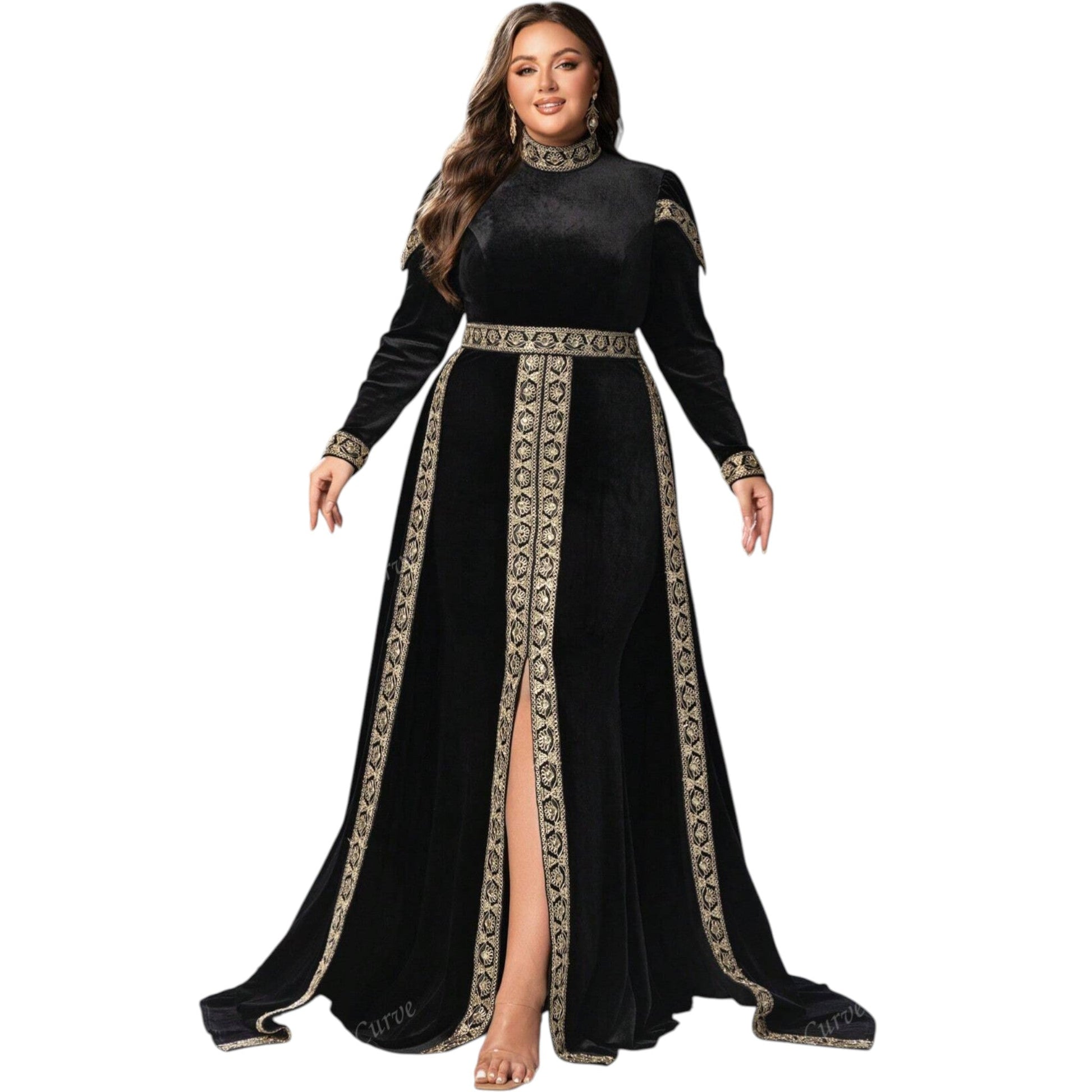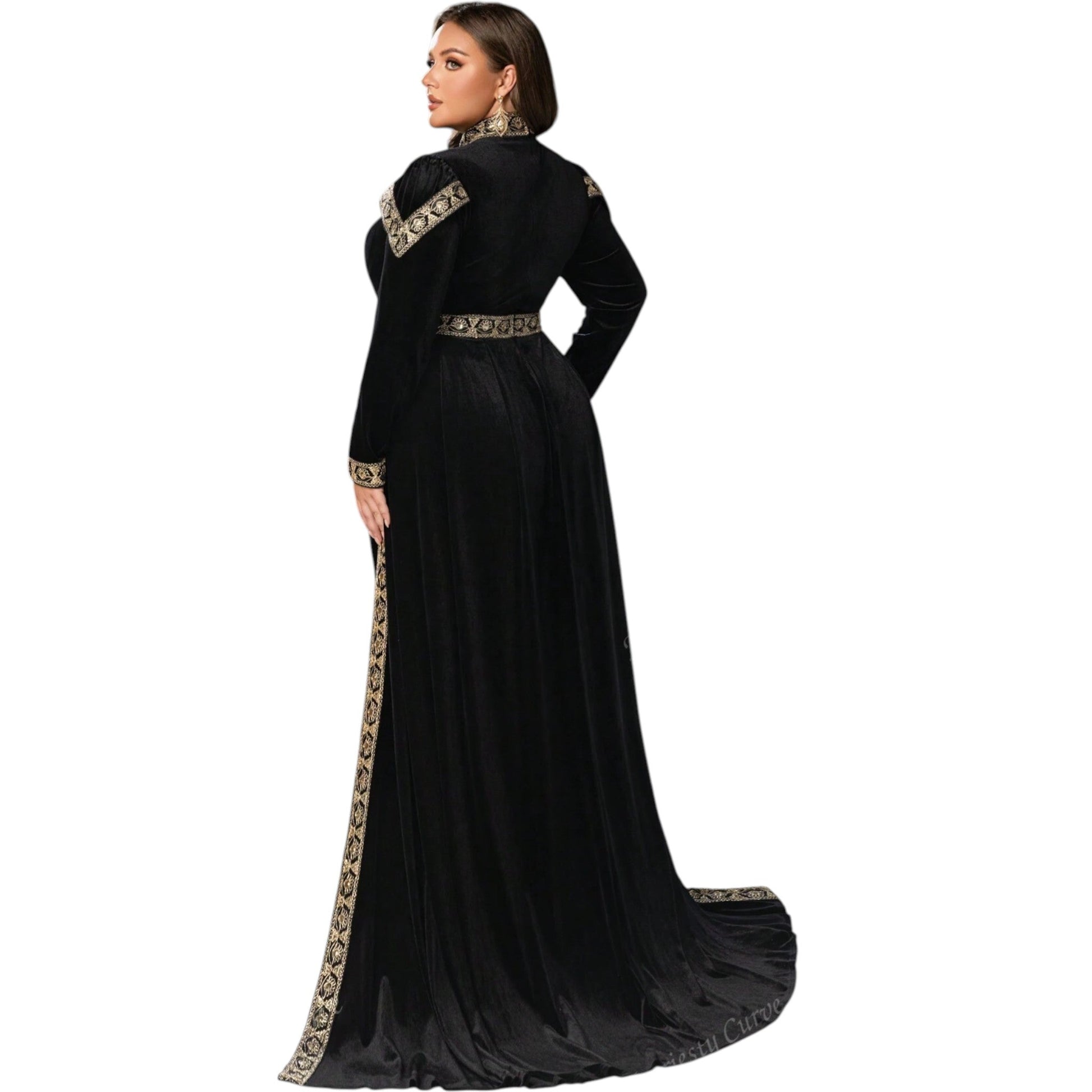 Címke nélküli, fekete, bársony anyagú, magas nyakú, hosszú ujjú, arany hímzett mintákkal, elöl sliccelt, maxi hosszúságú.