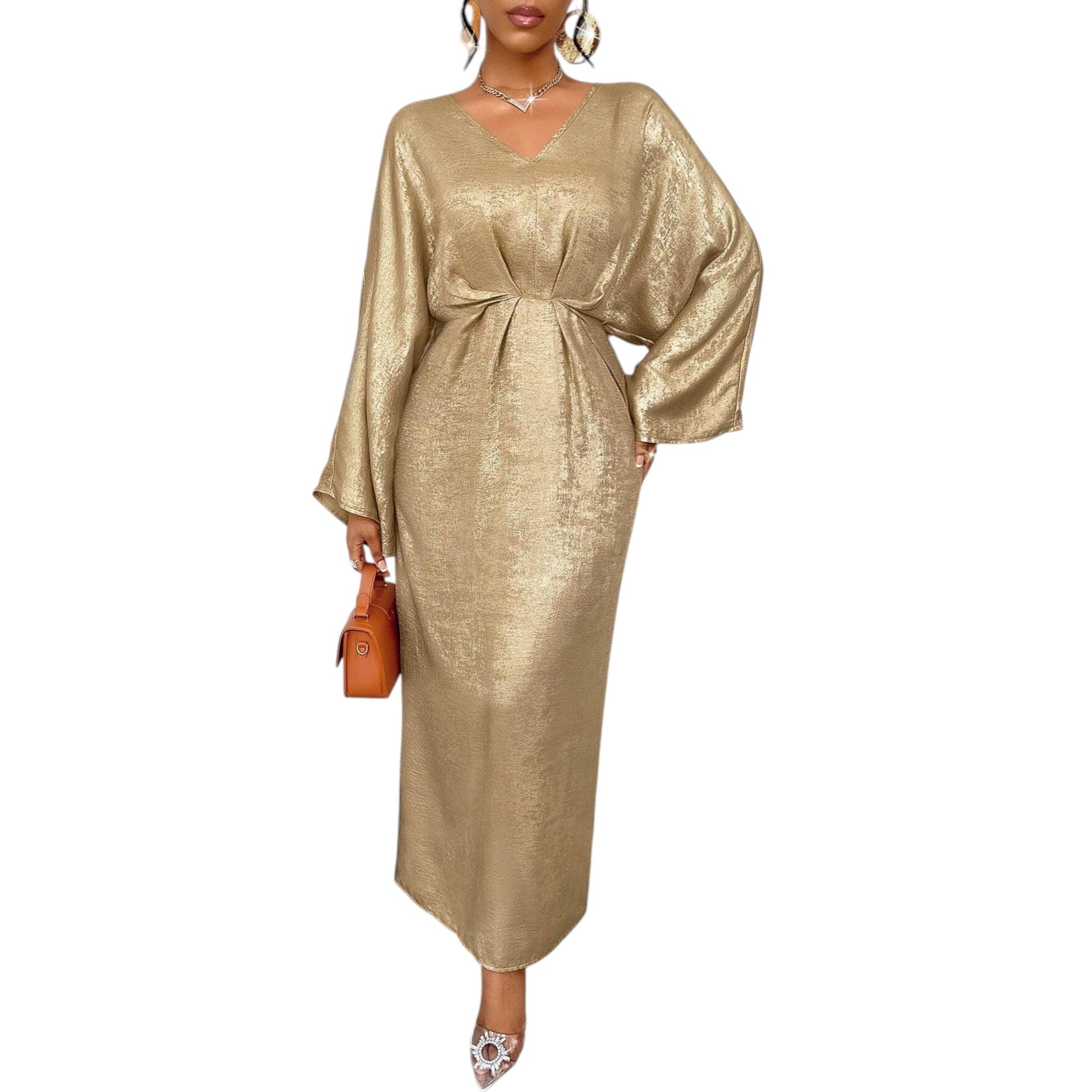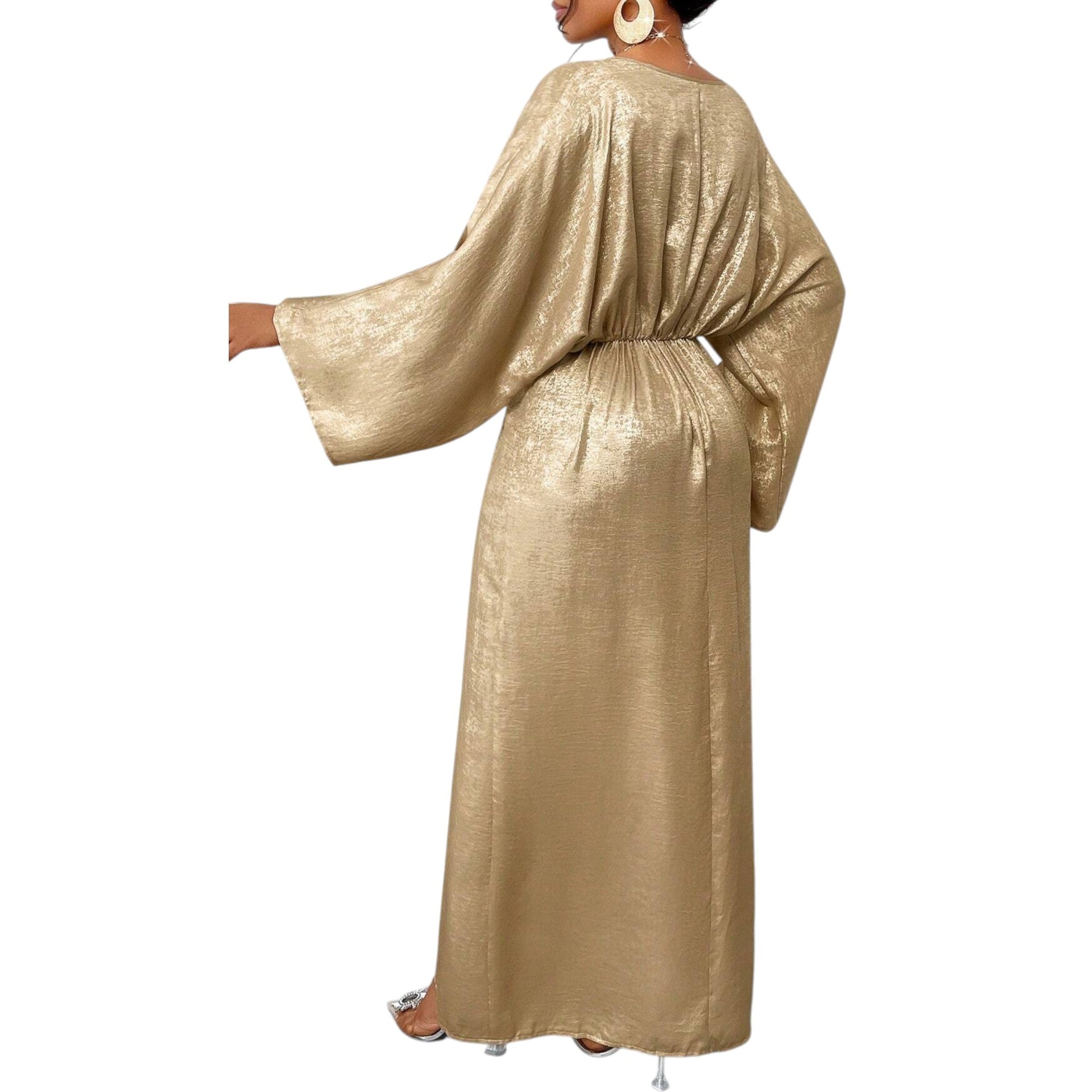 Címke nélküli, arany, V-nyakú, denevér ujjú, maxi hosszúságú.
