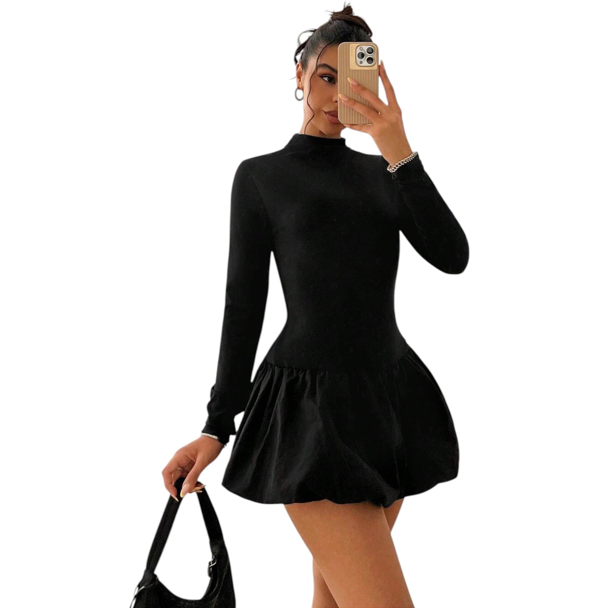 Címke nélküli, fekete, garbó nyakú, hosszú ujjú, fodros szoknyájú, mini hosszúságú.