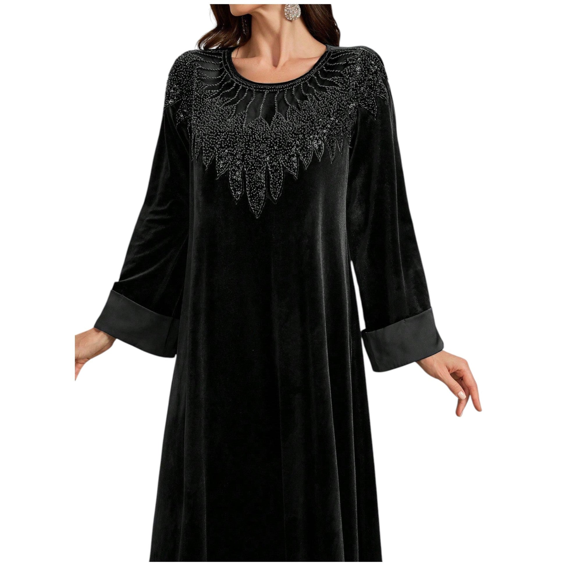 Címke nélküli, fekete, bársony anyagú, kerek nyakú, hosszú ujjú, flitteres díszítéssel a mellrészen, maxi hosszúságú.