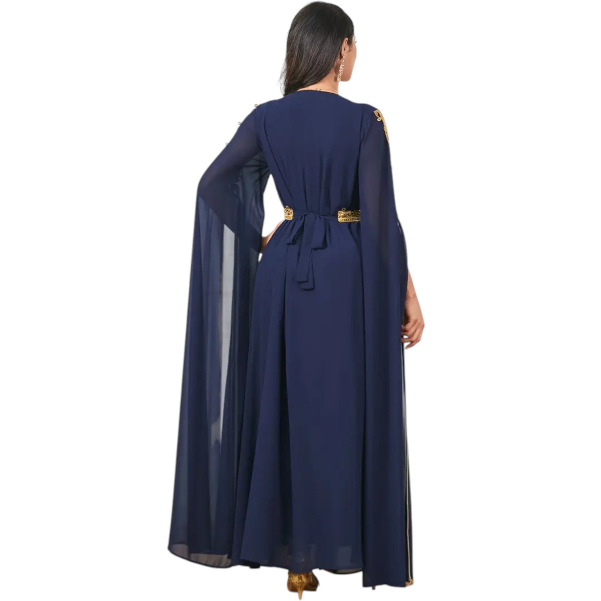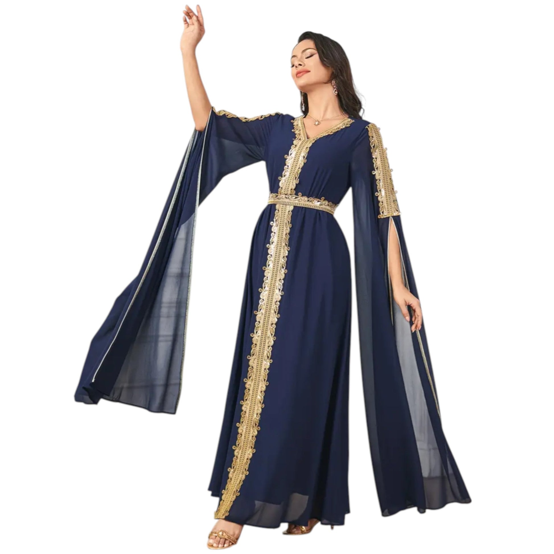 Címke nélküli, sötétkék, V-nyakú, bő ujjú, arany hímzéssel és flitterekkel, megkötős derékkal, maxi hosszúságú.