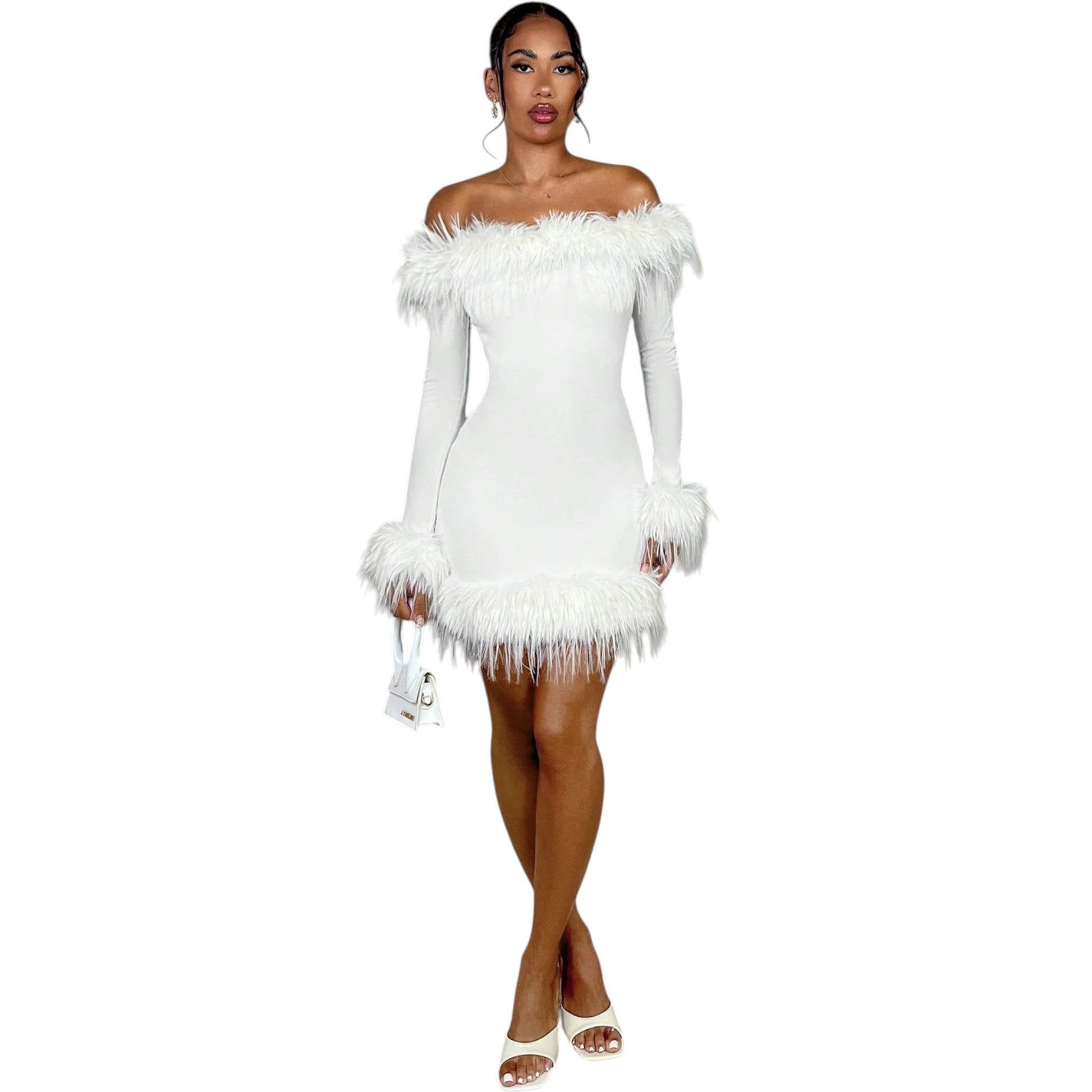 Címke nélküli, fehér, ejtett vállú, hosszú ujjú, szőrme díszítéssel a dekoltázson és a mandzsettákon, mini hosszúságú.