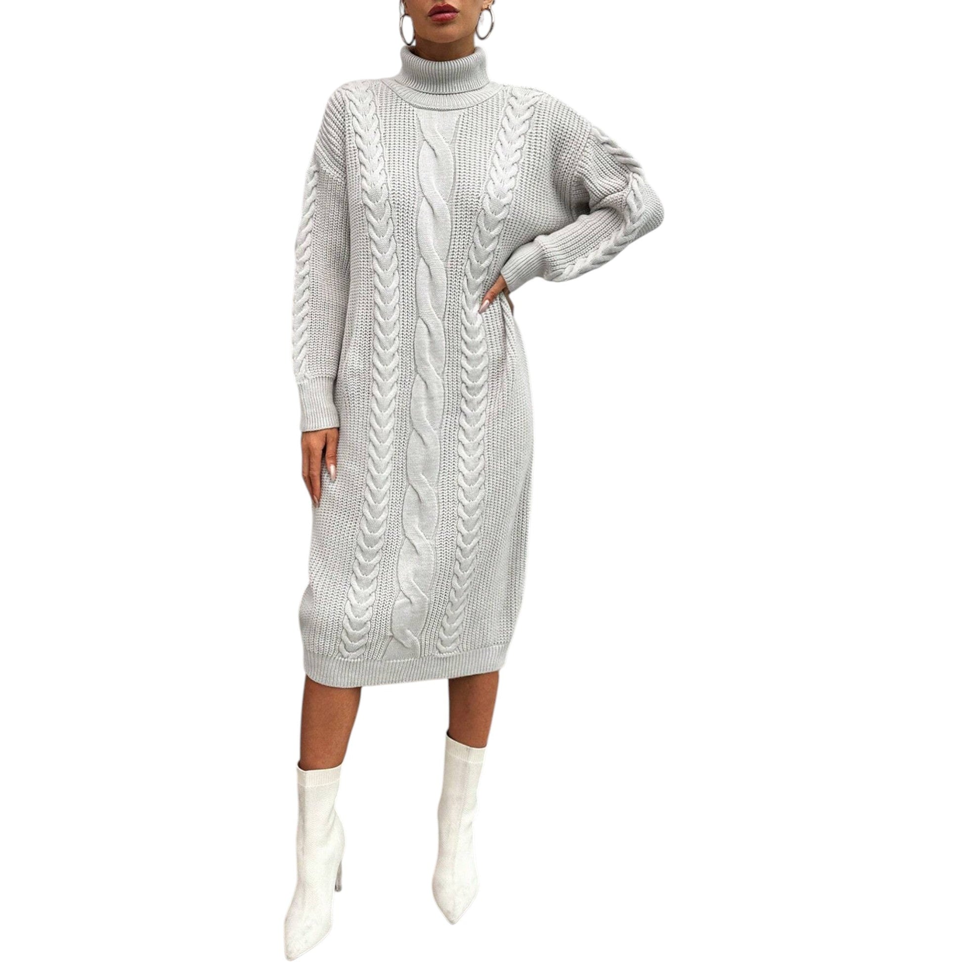 Címke nélküli, ekrü, kötött, hosszú ujjú, garbó nyakú, mintás, slim fit, midi ruha.