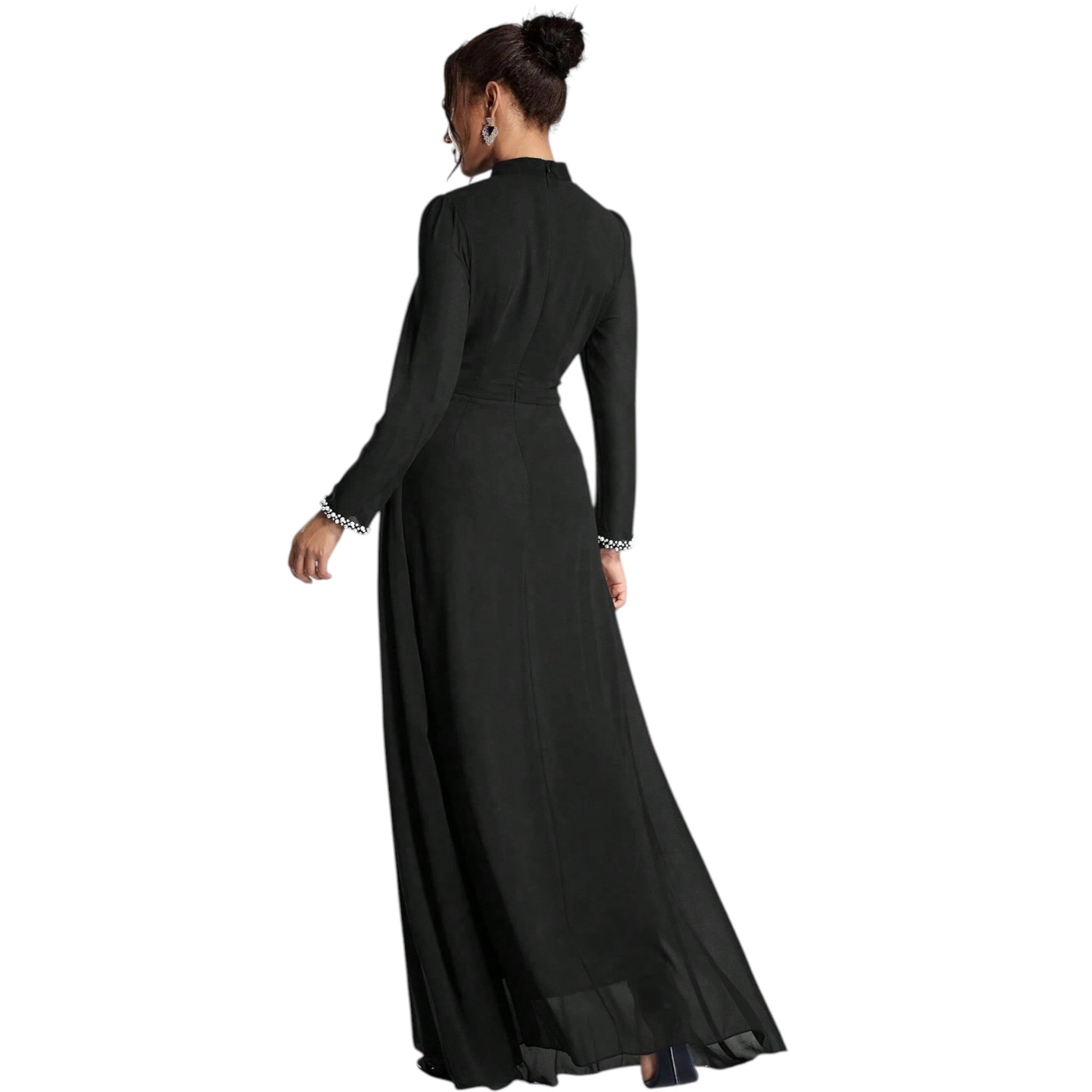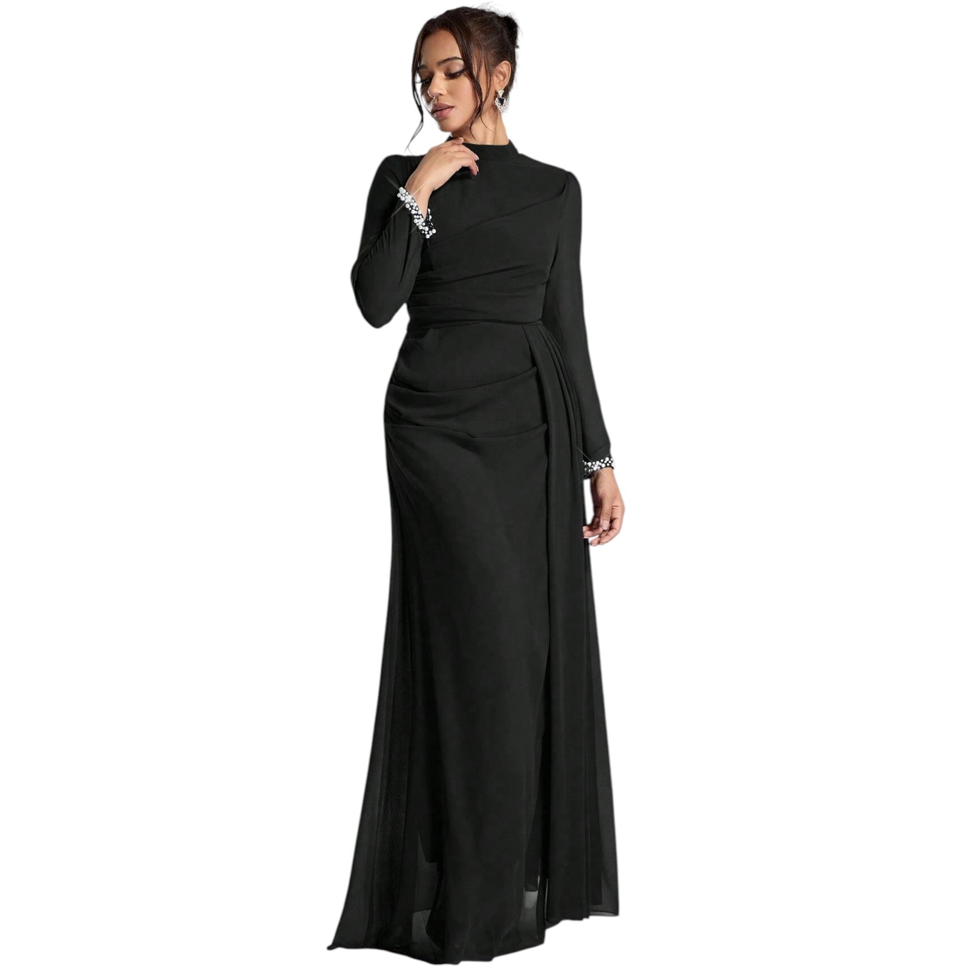 Címke nélküli, fekete, garbó nyakú, hosszú ujjú, gyöngyös mandzsettával, ruched derékrész, oldalt sliccelt, maxi hosszúságú.