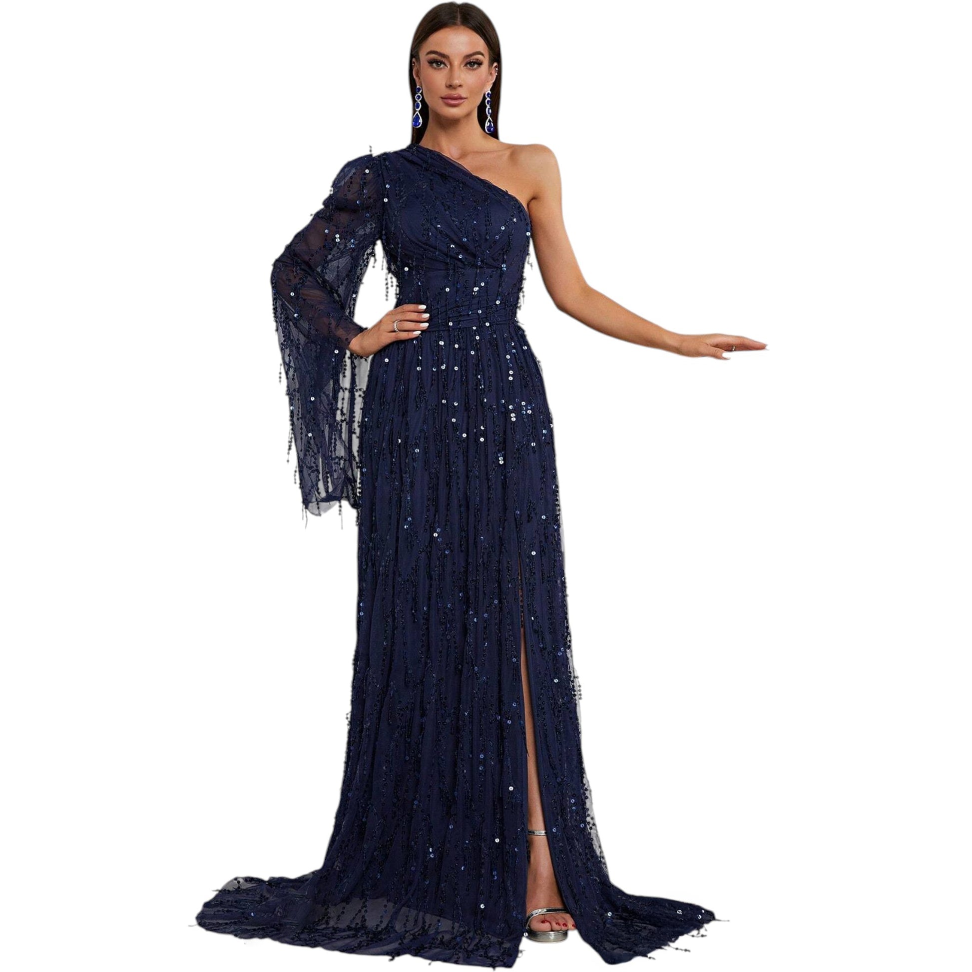 Címke nélküli, sötétkék, félvállas, hosszú maxi ruha, flitteres díszítéssel és magas oldalsó slicceléssel.