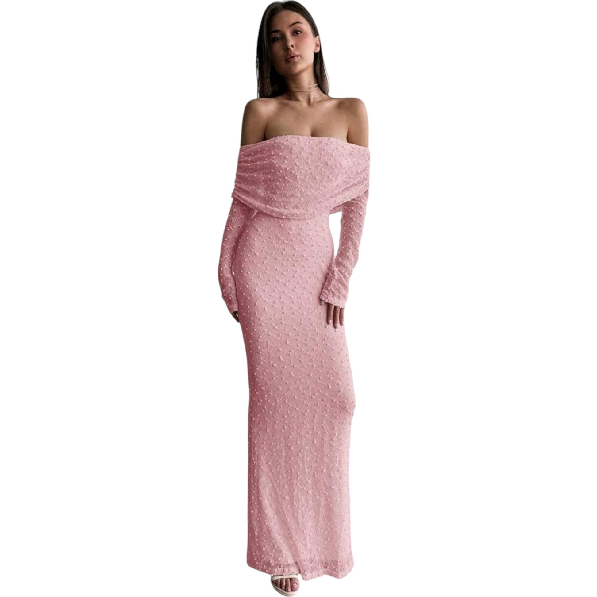 Címke nélküli, rózsaszín, hosszú ujjú, pánt nélküli, maxi ruha, pöttyös mintával.