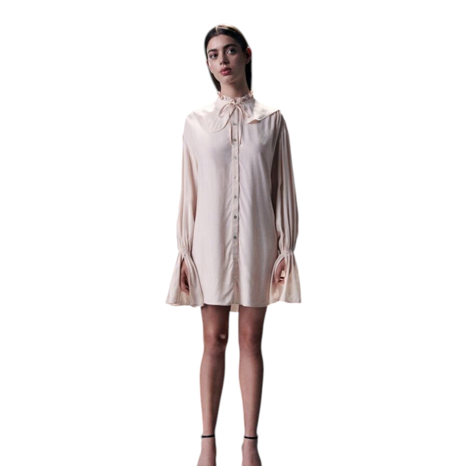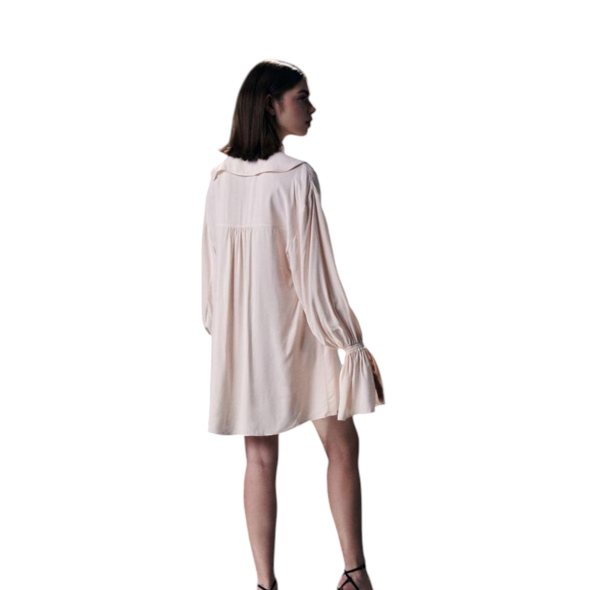 Címke nélküli, rózsaszín, elöl végig gombos, hosszú ujjú, mandzsettánál fodros, mini hosszúságú, nagy, lekerekített, fodros szélű galléros ingruha.