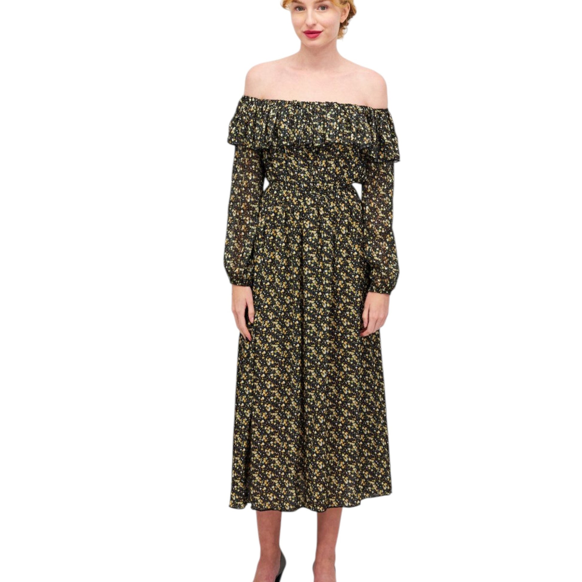 Címke nélküli, fekete és mustár sárga, hosszú ujjú midi ruha, vállon kívüli/bardot nyakú, nyakkivágásnál fodros, virágmintás, derekán húzott, enyhén áttetsző anyagú.