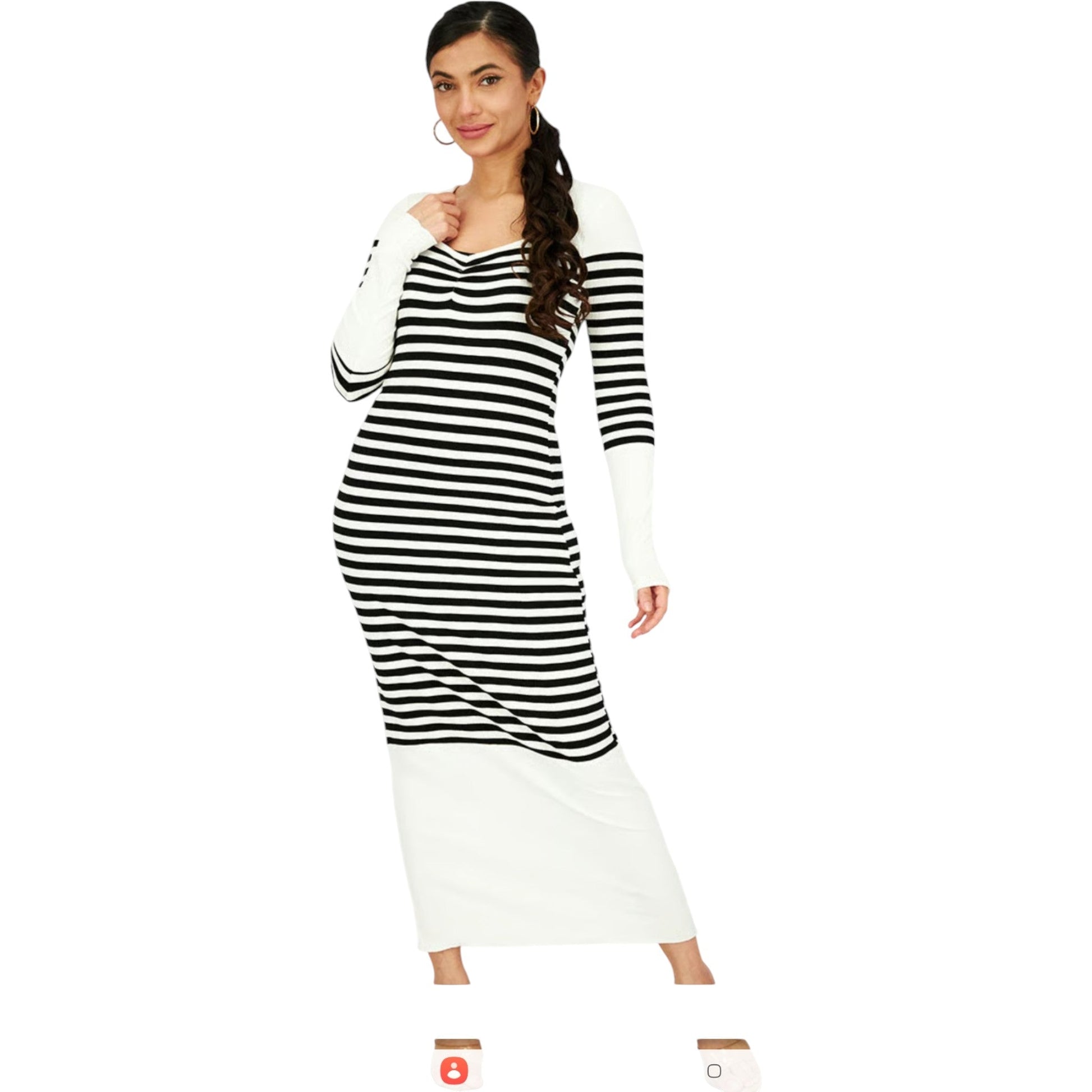 Címke nélküli, fekete/fehér, hosszú ujjú, kerek/V-nyakú, testhezálló, kötött maxi ruha, fekete-fehér vízszintes csíkos mintával és egyszínű fehér részekkel.