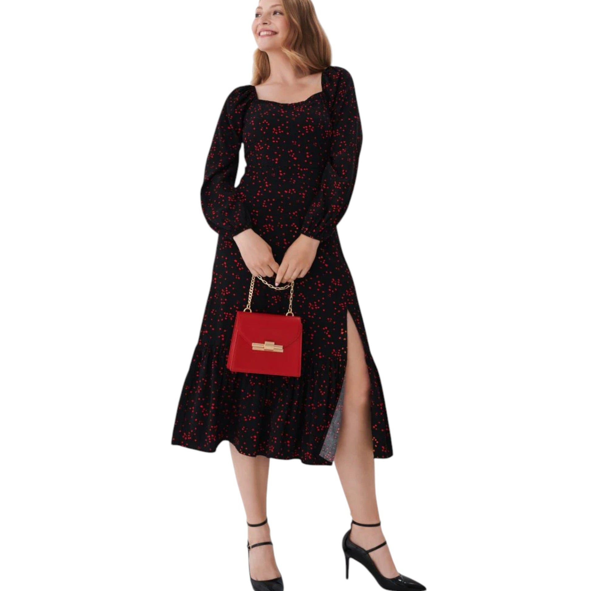 Címke nélküli, fekete, apró piros pont mintás, hosszú, enyhén puffos ujjú, négyzet alakú nyakú, bővülő szoknyarész alján fodorral, oldalt magasan felvágott, midi hosszúságú.