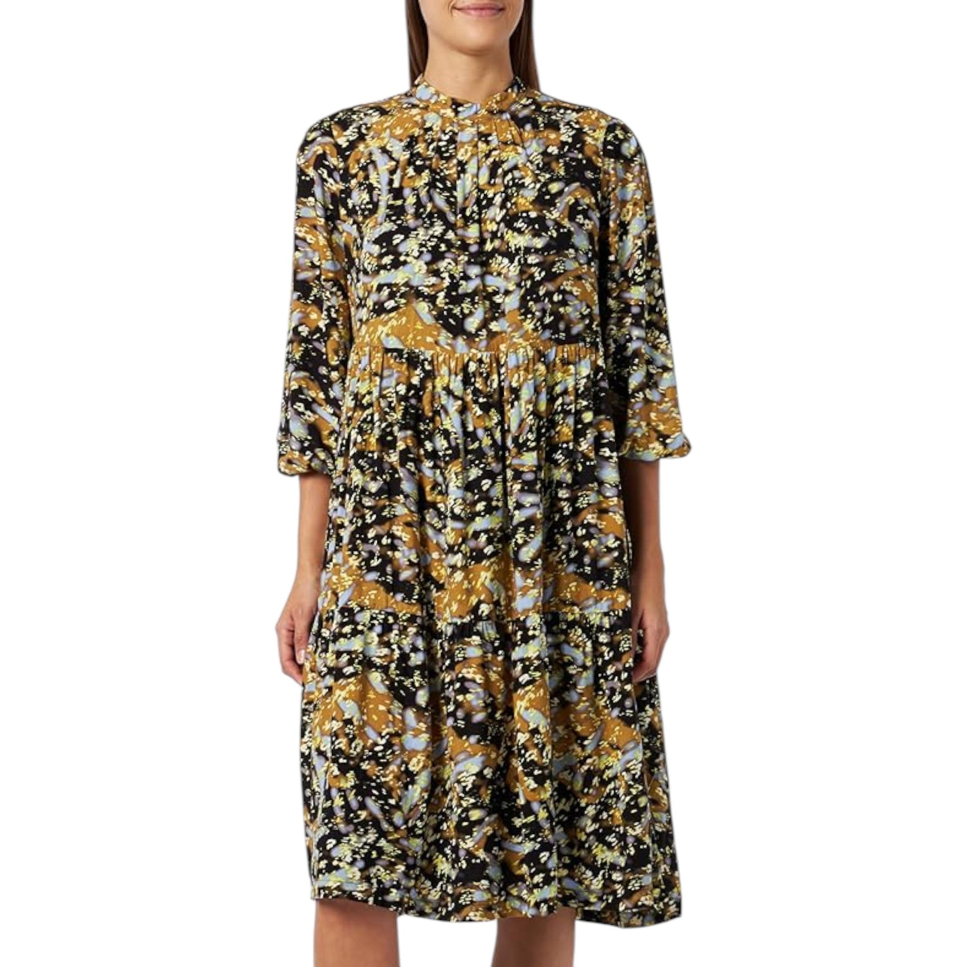 Címke nélküli, sárga (alapszín), fekete, kék és zöld foltos mintás, 3/4-es ujjú, állógallérra ráncolt nyakú, maxi ruha, bő szabású szoknyarész, hátul gombbal záródó csepp alakú kivágás.