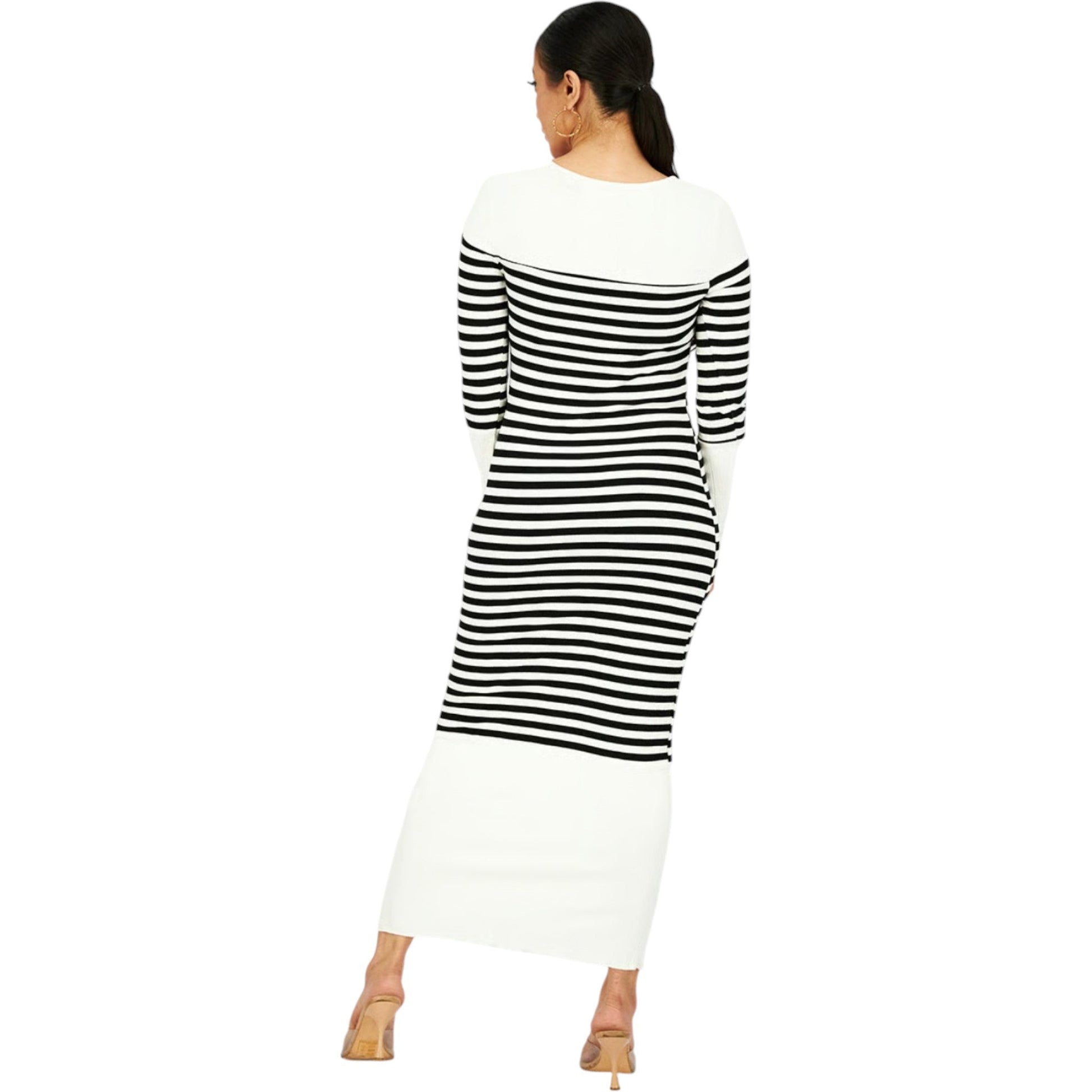 Címke nélküli, fekete/fehér, hosszú ujjú, kerek/V-nyakú, testhezálló, kötött maxi ruha, fekete-fehér vízszintes csíkos mintával és egyszínű fehér részekkel.