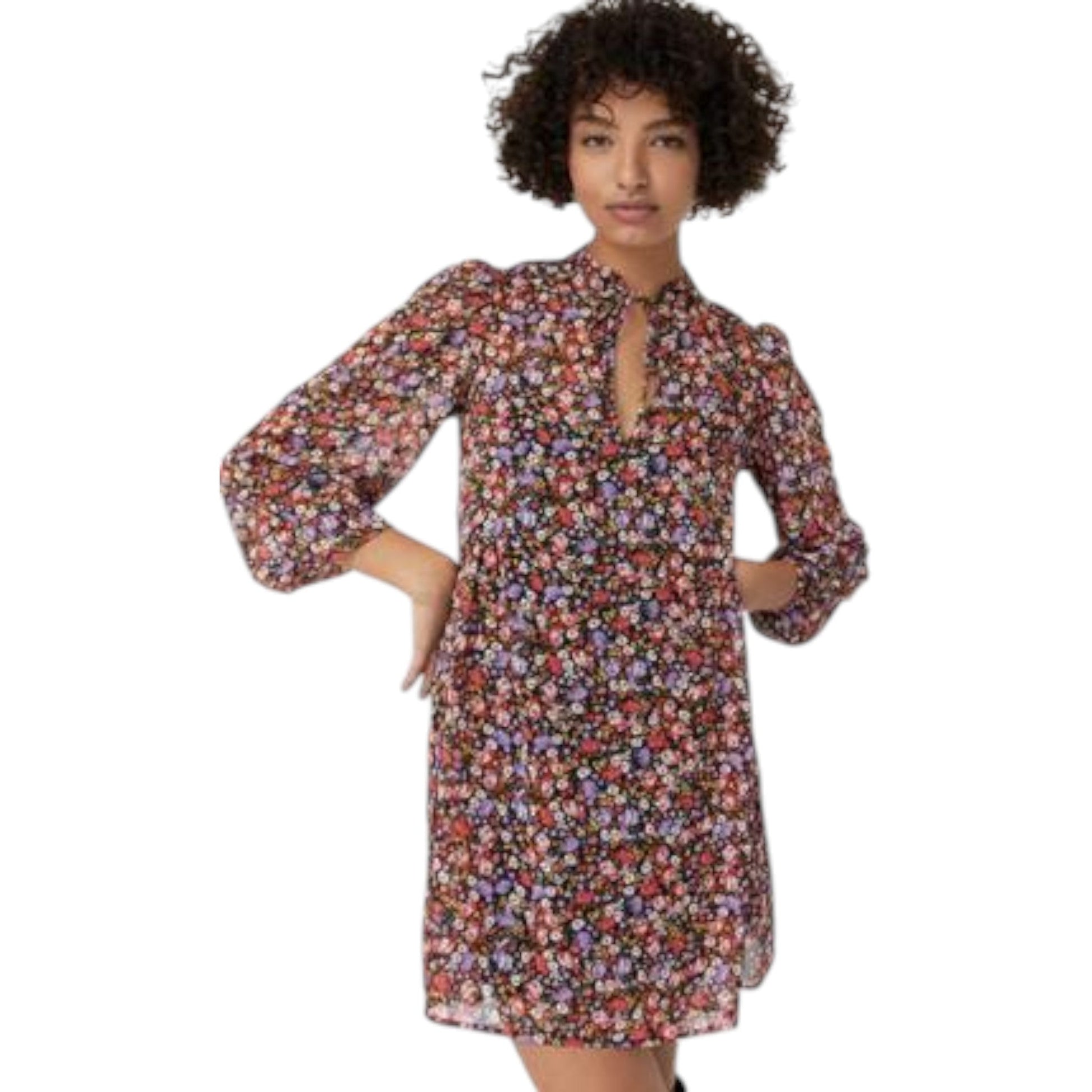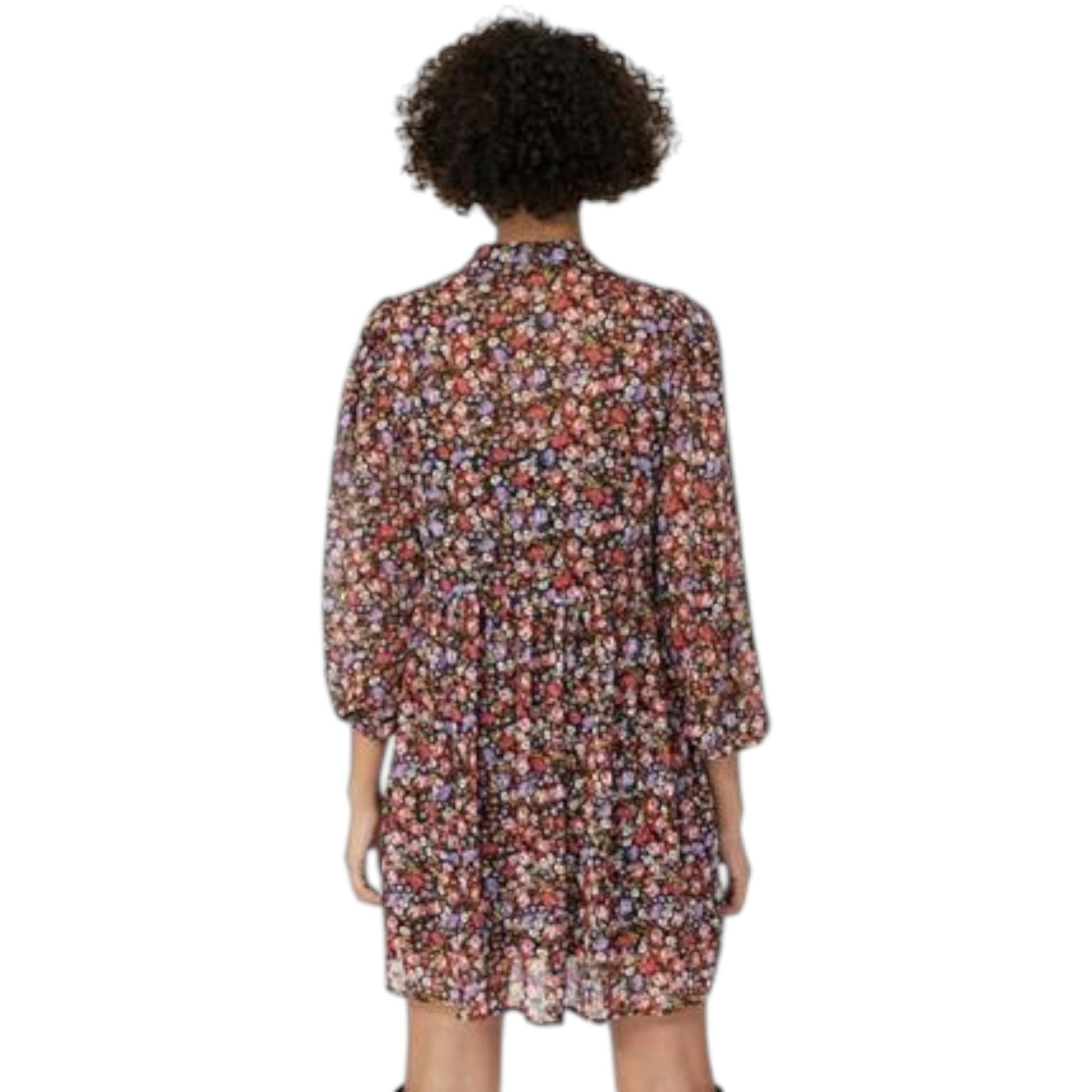 Címke nélküli, fekete, sokszínű virágmintás, 3/4-es puffos ujjú, magas, ráncolt nyakú mini ruha, nyakon V-alakú kivágással, bő szoknyarész.