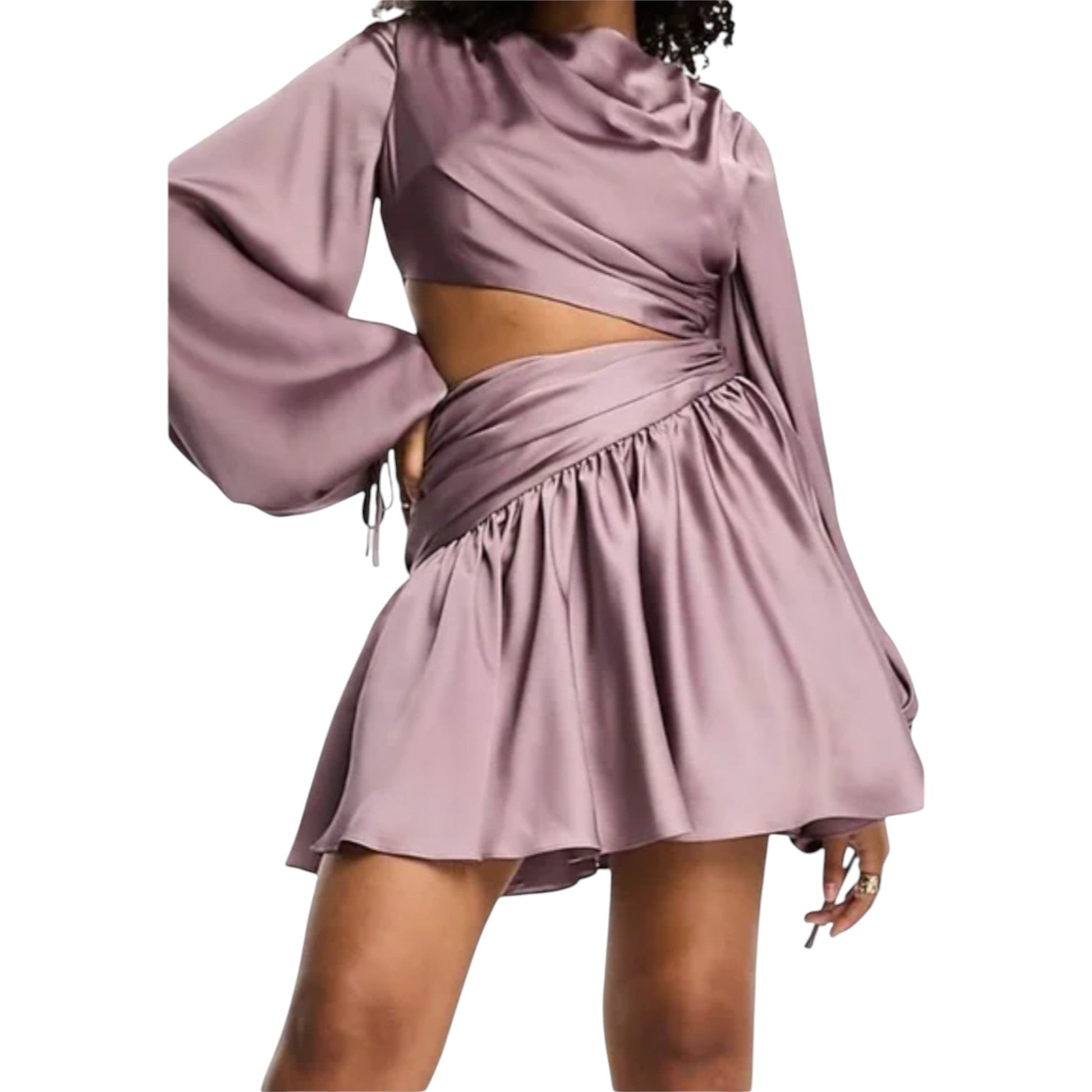 Címke nélküli, mályva, selyem hatású anyagú, magasan záródó nyakú, hosszú, bő ujjú, elöl kivágott derék résznél, mini szoknyás, ruha.