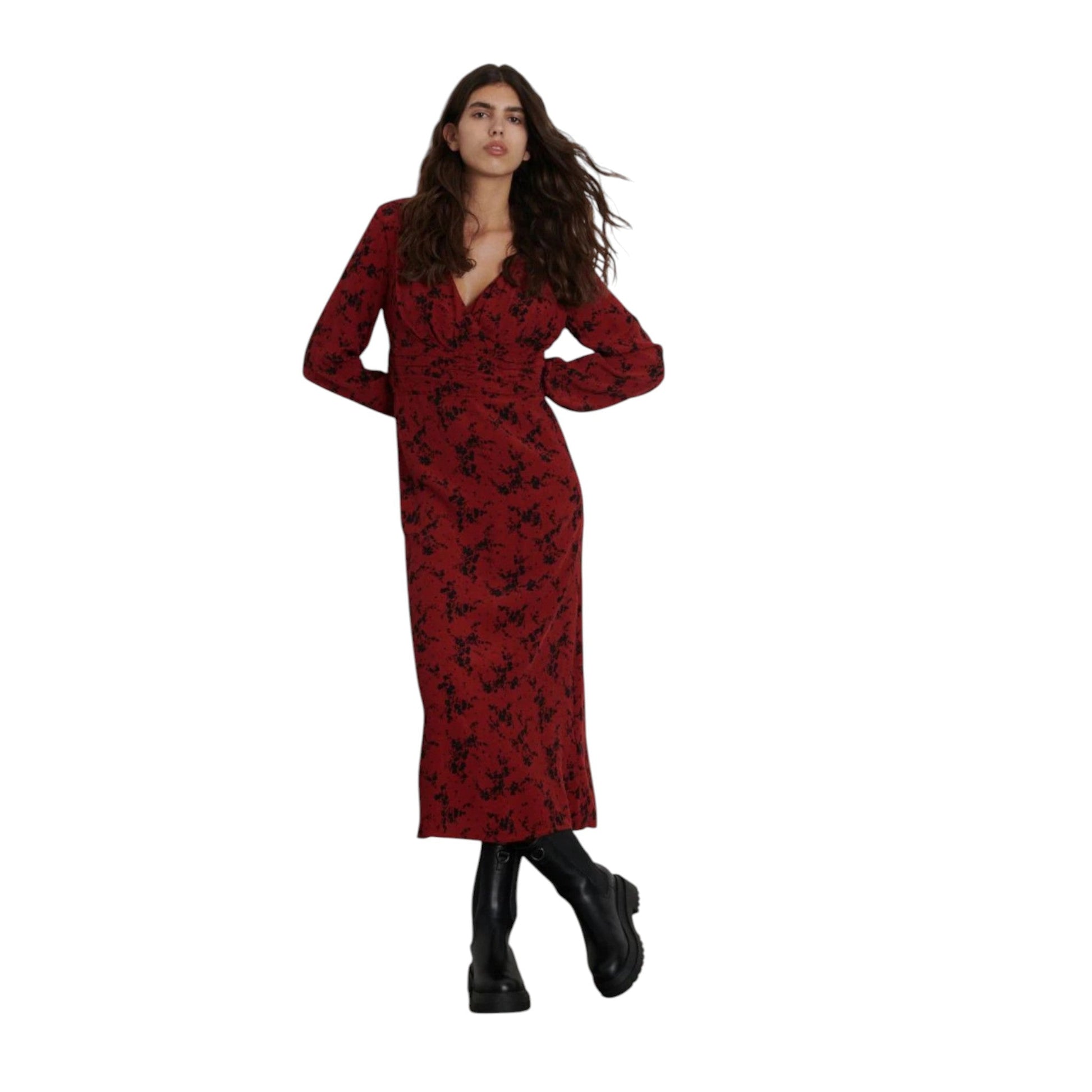 Címke nélküli, piros, fekete virágmintás, V-nyakú, hosszú ujjú, midi fazon, húzott anyagú a derékrészen, ruha.