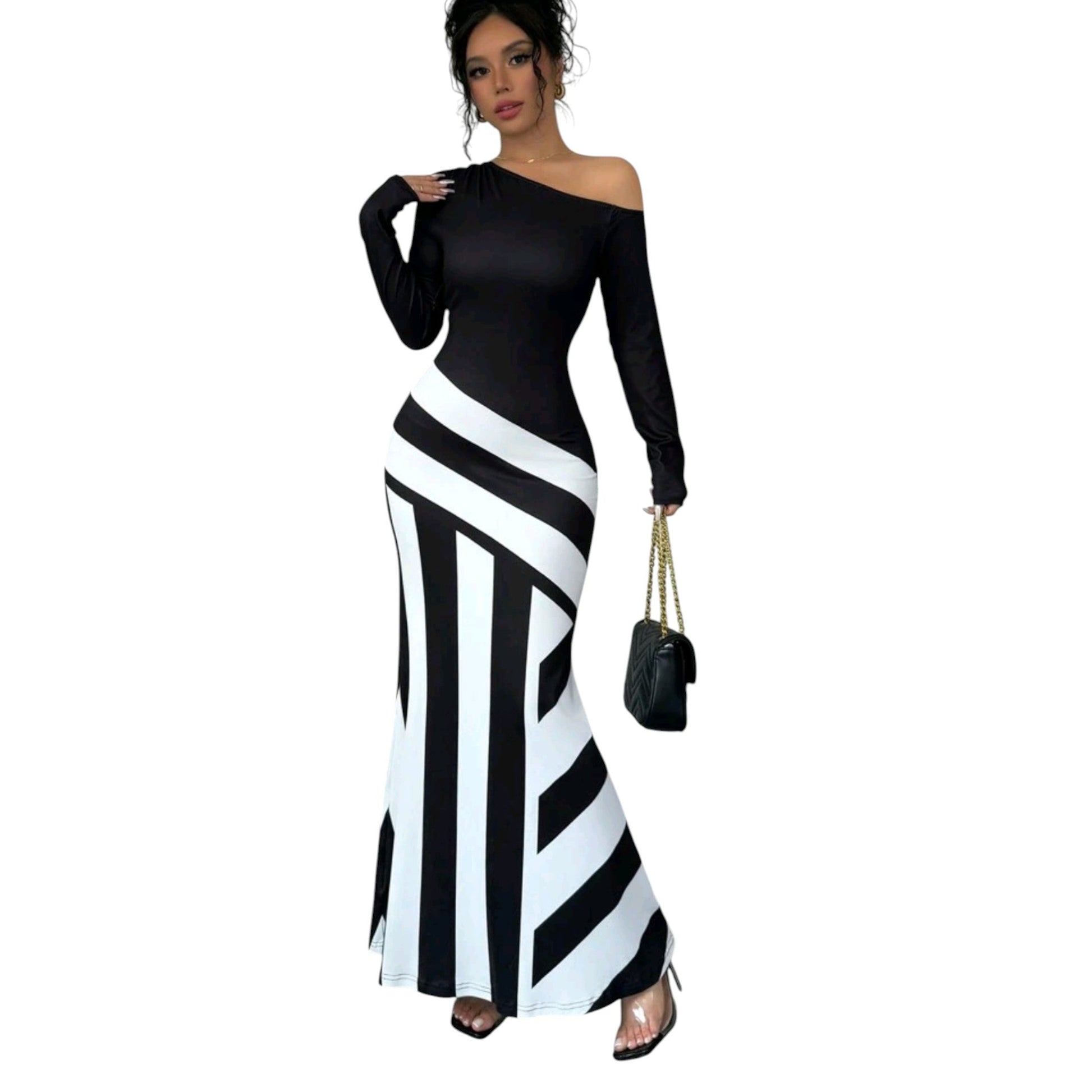 Címke nélküli, fekete, széles fehér csíkos, hosszú ujjú, félvállas/vállt szabadon hagyó nyakú, testhez simuló, alul sellő fazonban bővülő, maxi hosszúságú.
