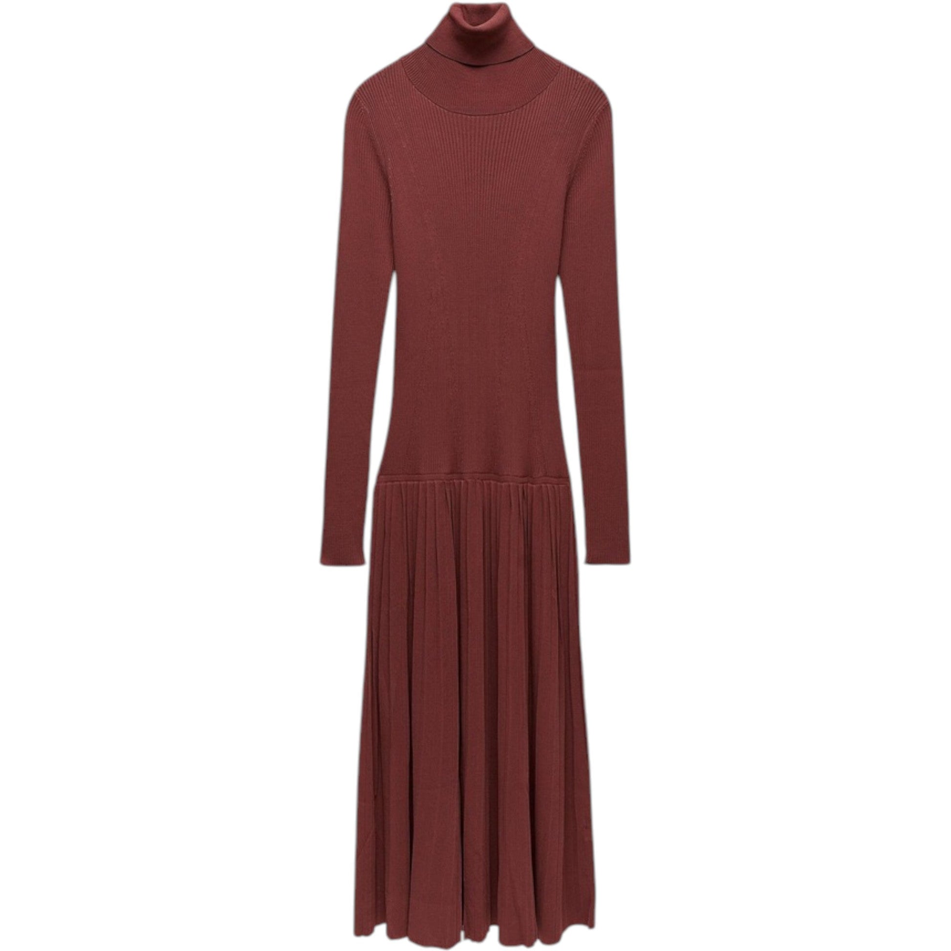 Címke nélküli, rozsdabarna, hosszú ujjú, garbós, kötött/bordázott anyagú, midi ruha, a derékrésztől pliszírozott (rakott) szoknyával.