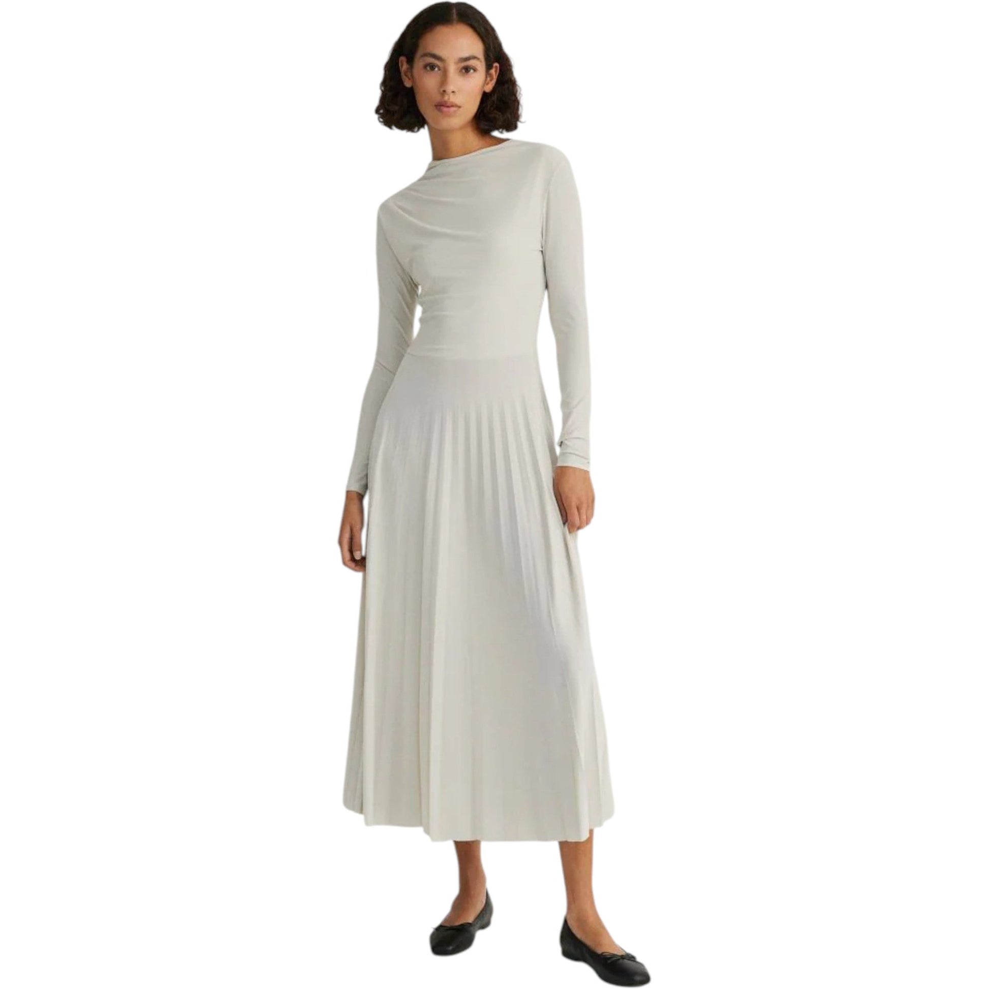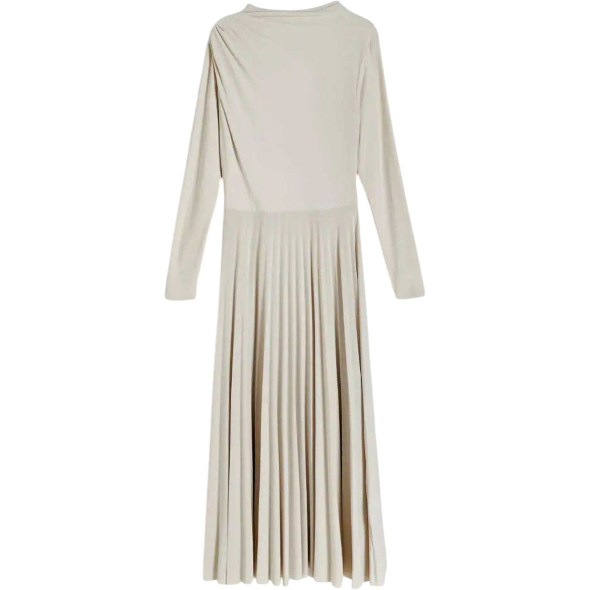 Címke nélküli, törtfehér, hosszú ujjú, garbós nyakú (ráncolt), midi ruha, szűkített felső rész, rakott (pliszírozott) szoknyarész.
