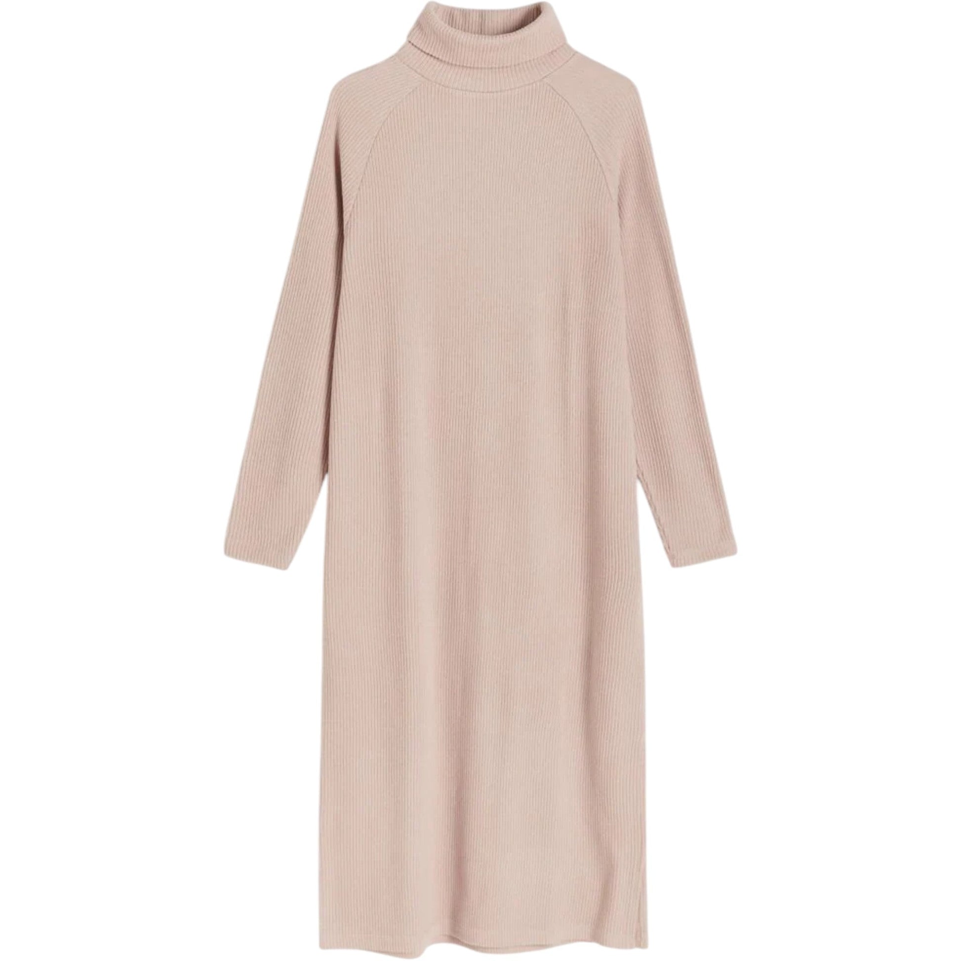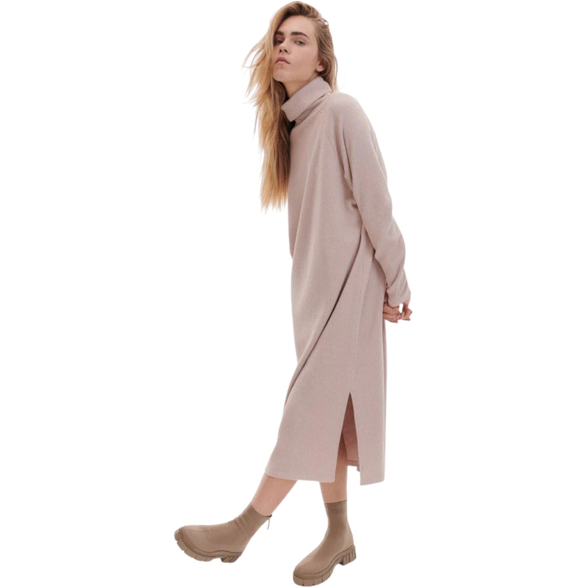 Címke nélküli, bézs, hosszú ujjú, garbós, bordázott kötött anyagú midi ruha, egyenes/enyhén oversize fazon, oldalt slicceléssel a ruha alján.