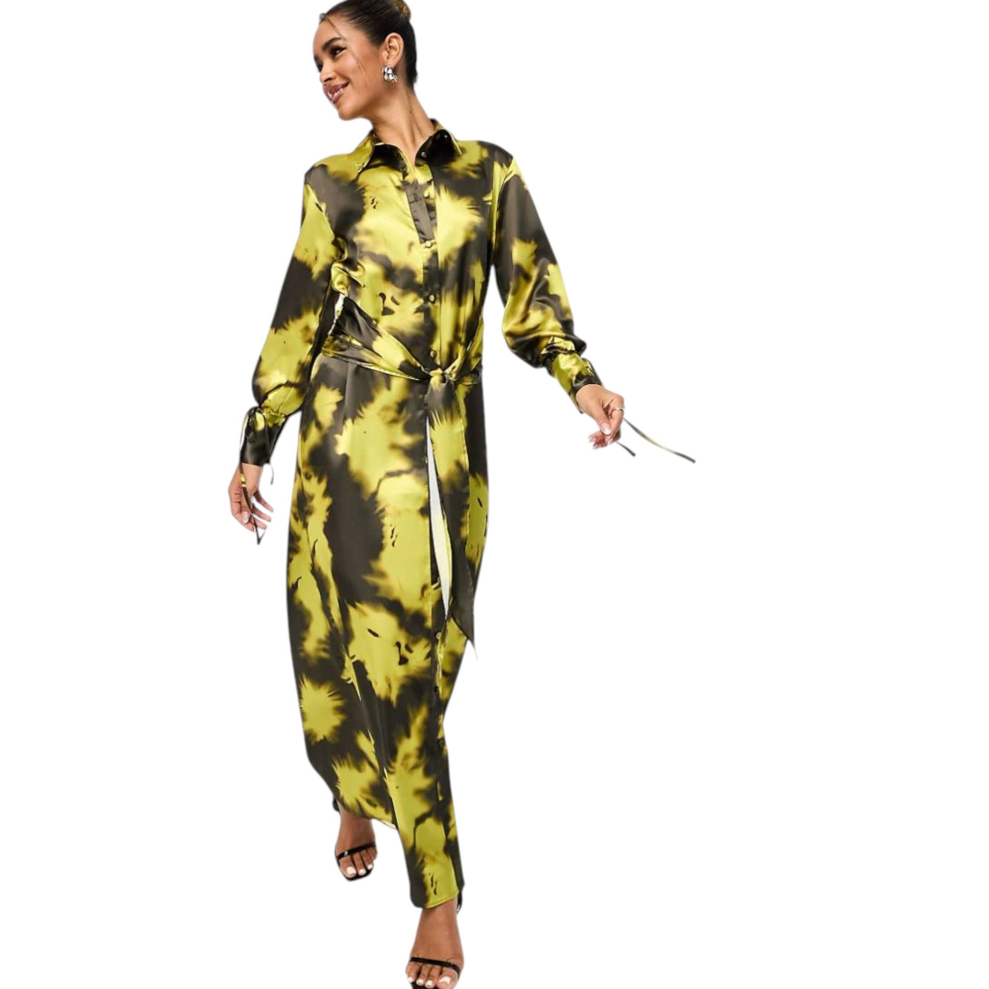 Címke nélküli, citromsárga és fekete/sötétzöld, hosszú ing ruha, galléros, hosszú ujjú, elöl gombolásos, batikolt/foltos mintás, derekán megköthető/kötős, selyem hatású/fényes anyagú, gombos mandzsettás.