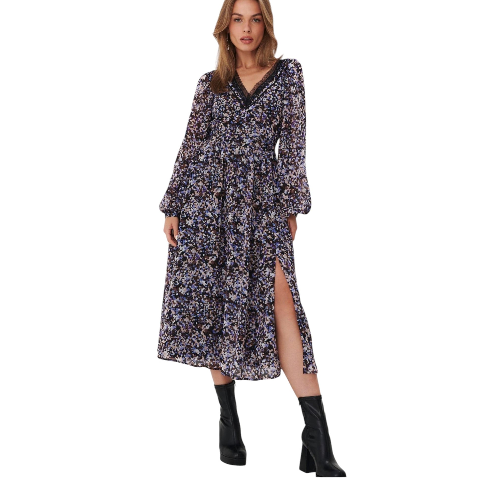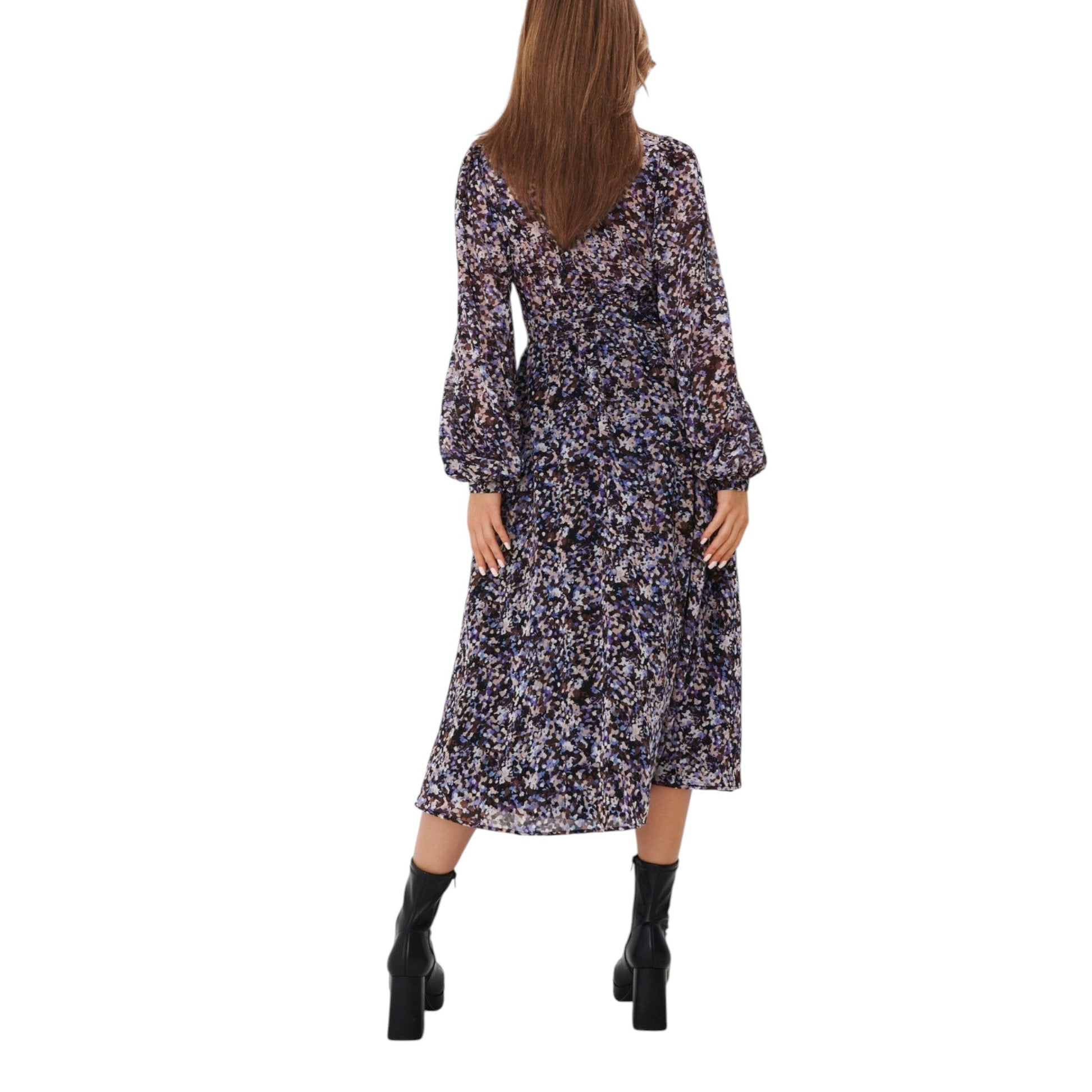 Címke nélküli, fekete alapon többszínű (lila, kék, rózsaszín) virágmintás midi ruha, V-nyakú, hosszú puffos ujjú, derekán húzott, elöl hasítékkal, enyhén áttetsző anyagú.