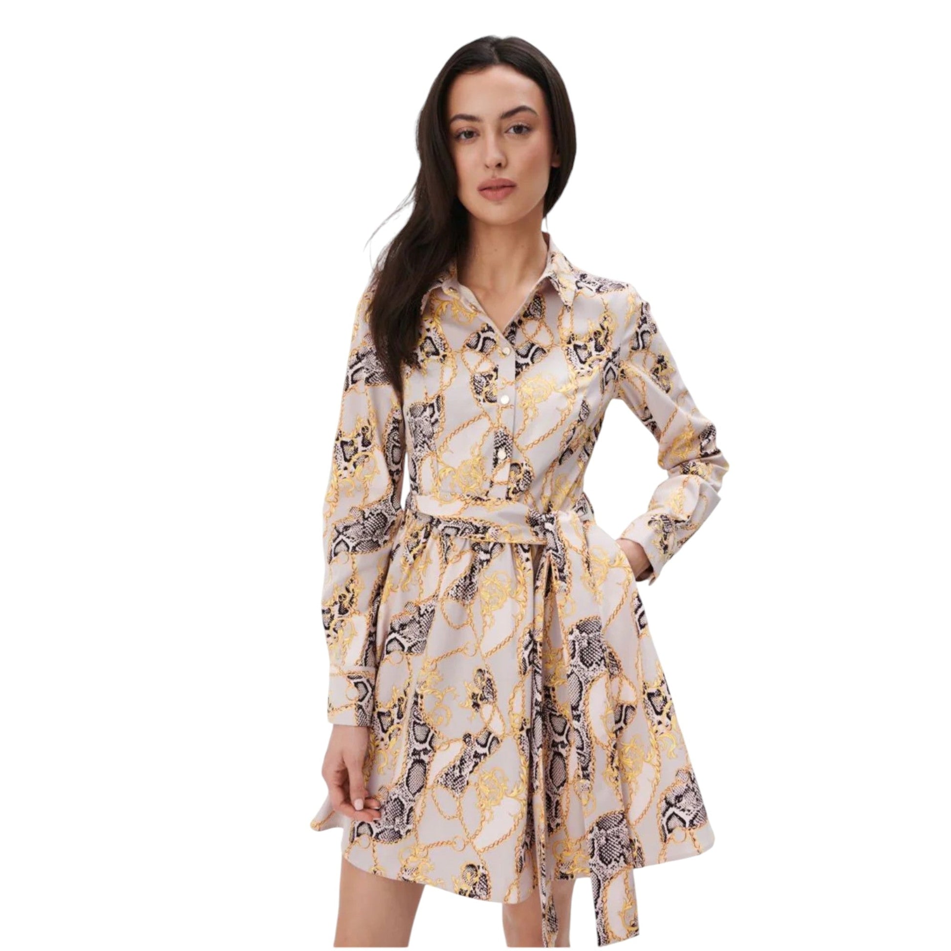 Címke nélküli, bézs/krém, arany lánc és kígyóbőr mintás, hosszú ujjú, inggalléros, elöl végig gombos, megkötős/masnis derékrésszel (övet figyelmen kívül hagyva), bővülő szoknyájú, mini hosszúságú ingruha.