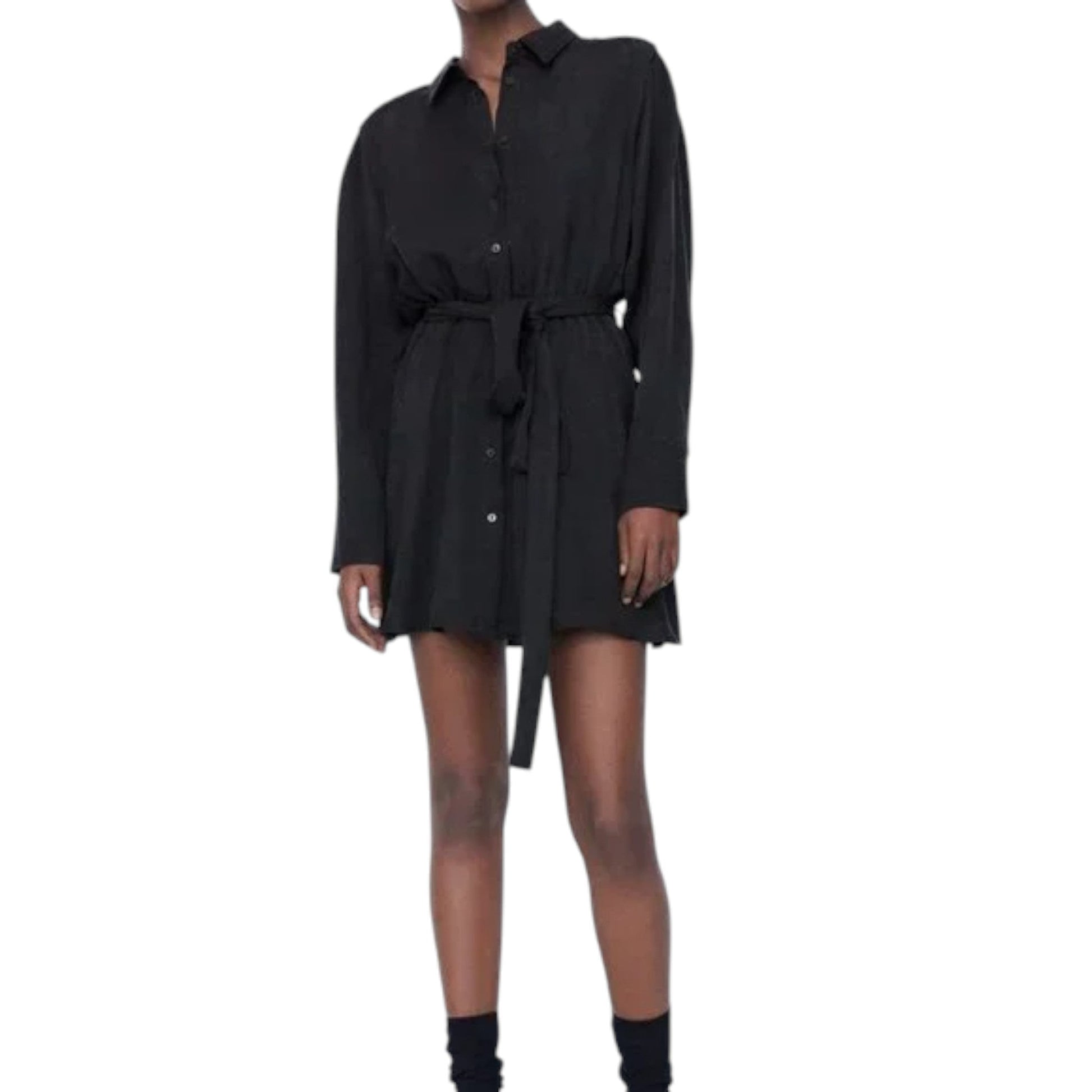 Címke nélküli, fekete, hosszú ujjú, inggalléros, elöl végig gombolós, bő szabású, mini hosszúságú. (Az övet figyelmen kívül hagyva.)