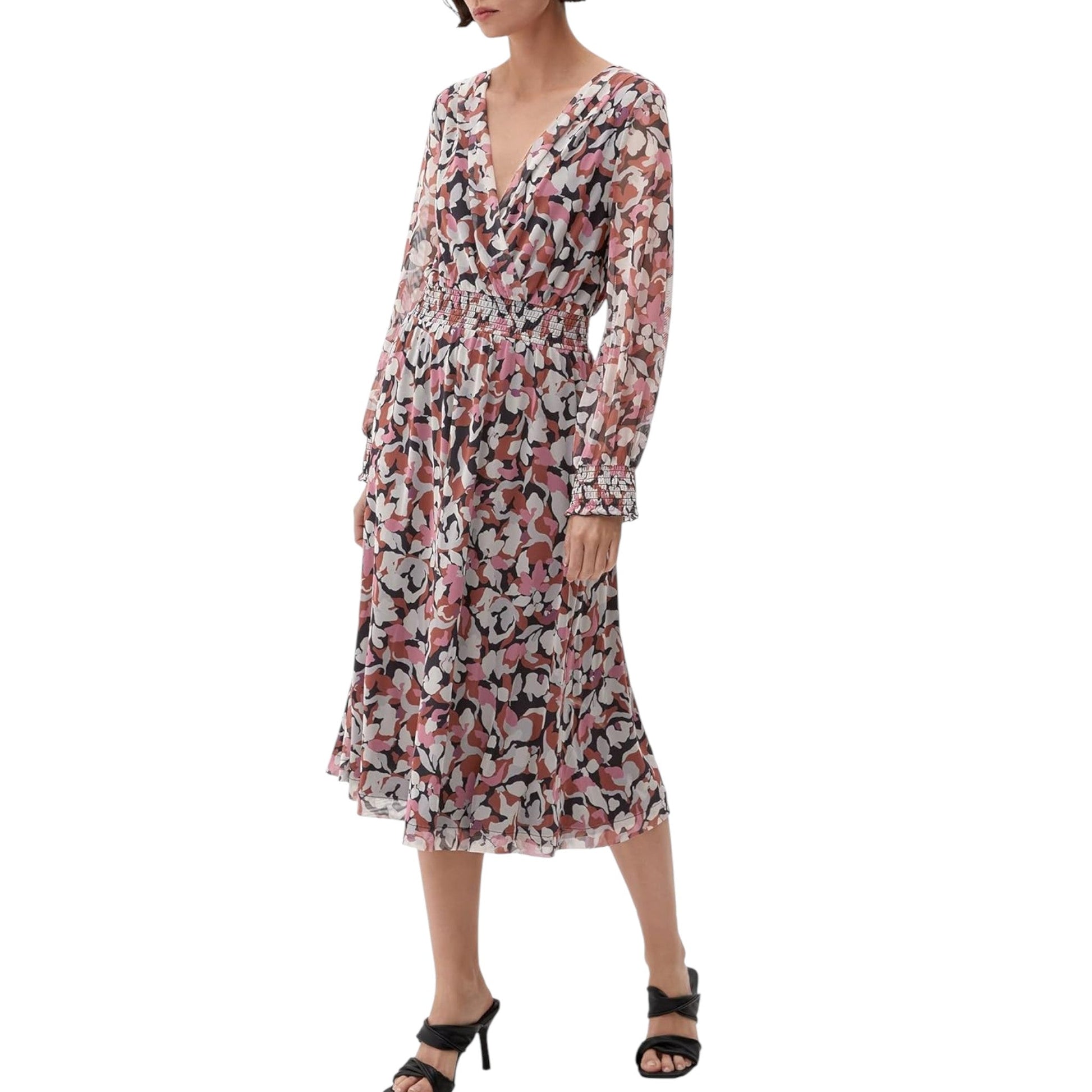 S. OLIVER rózsaszín virágmintás V-nyakú midi ruha