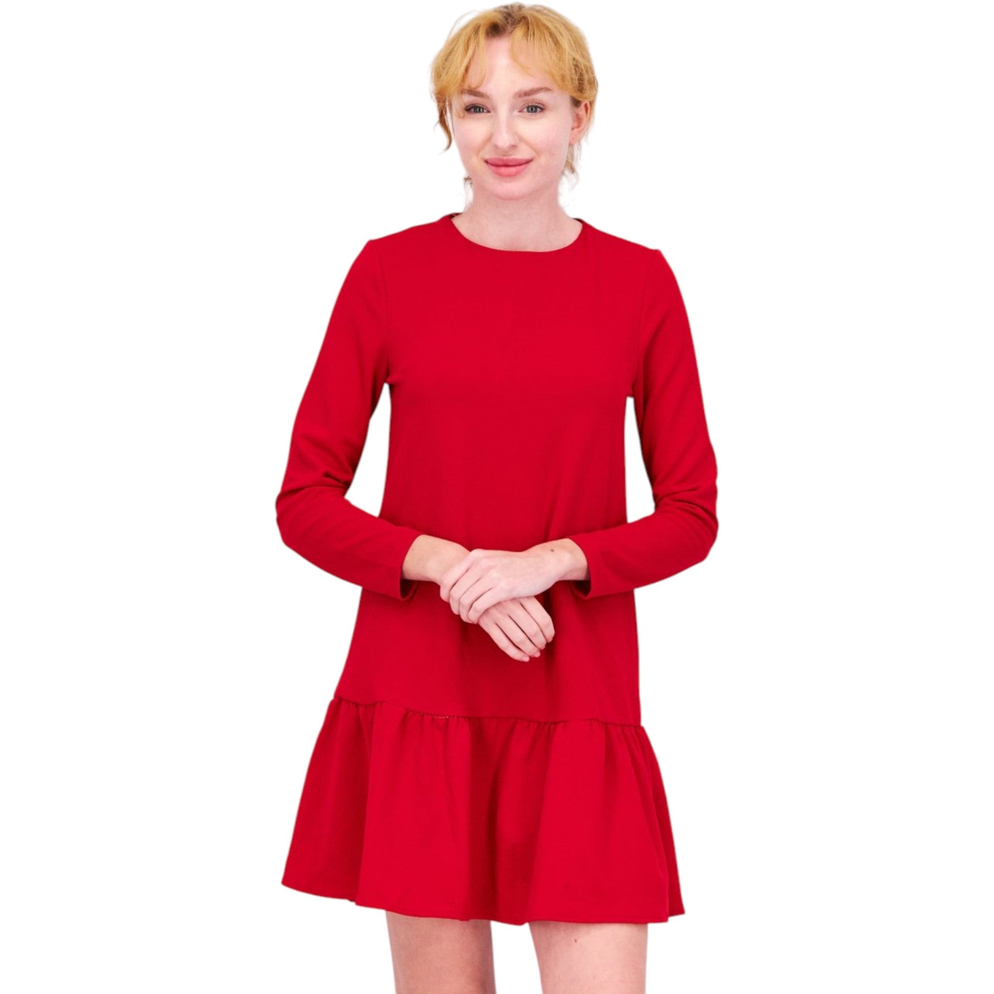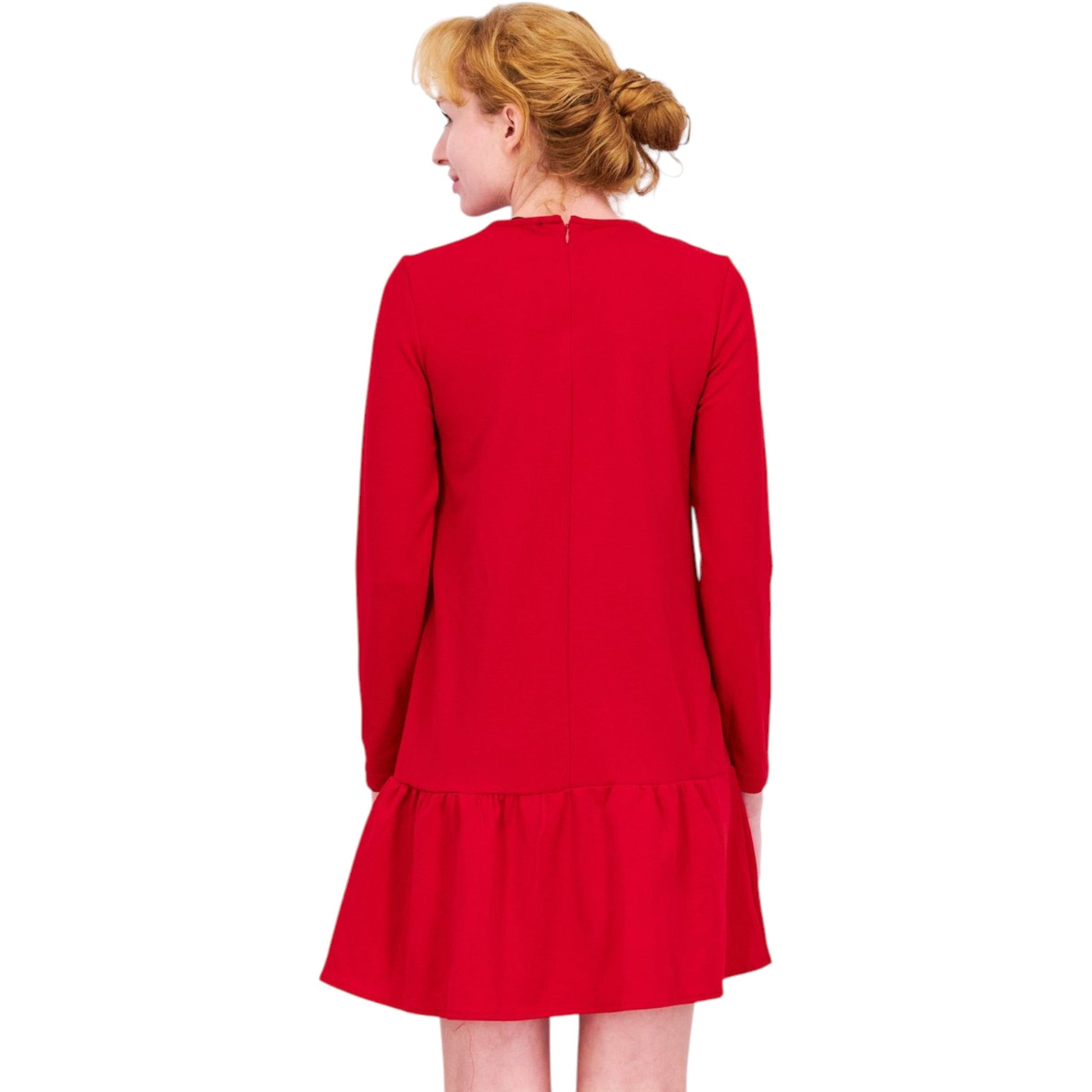 Címke nélküli, piros, hosszú ujjú, kerek nyakú, bő szabású mini ruha, alján körben fodros résszel. Hátul cipzárral záródik.