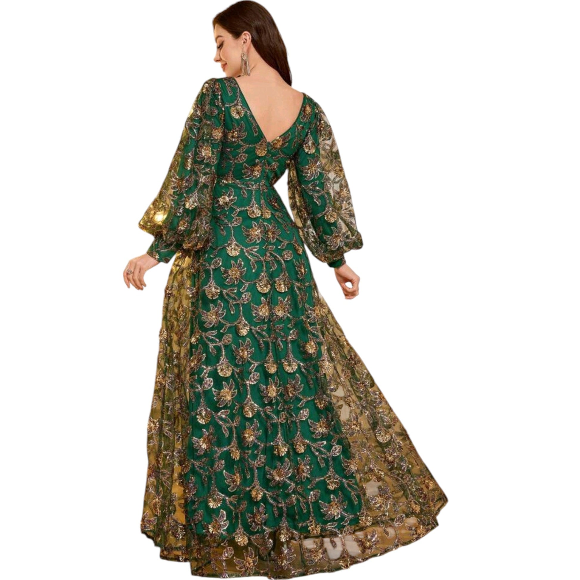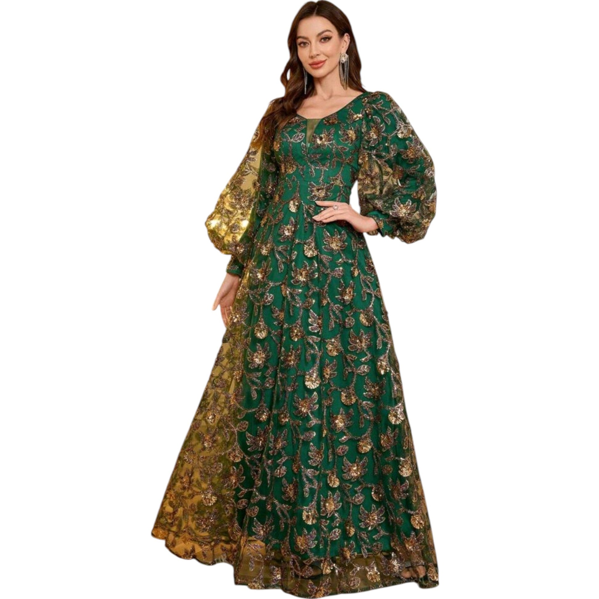 Címke nélküli, zöld, arany hímzéssel és flitterekkel díszített, hosszú, puffos ujjú estélyi ruha.