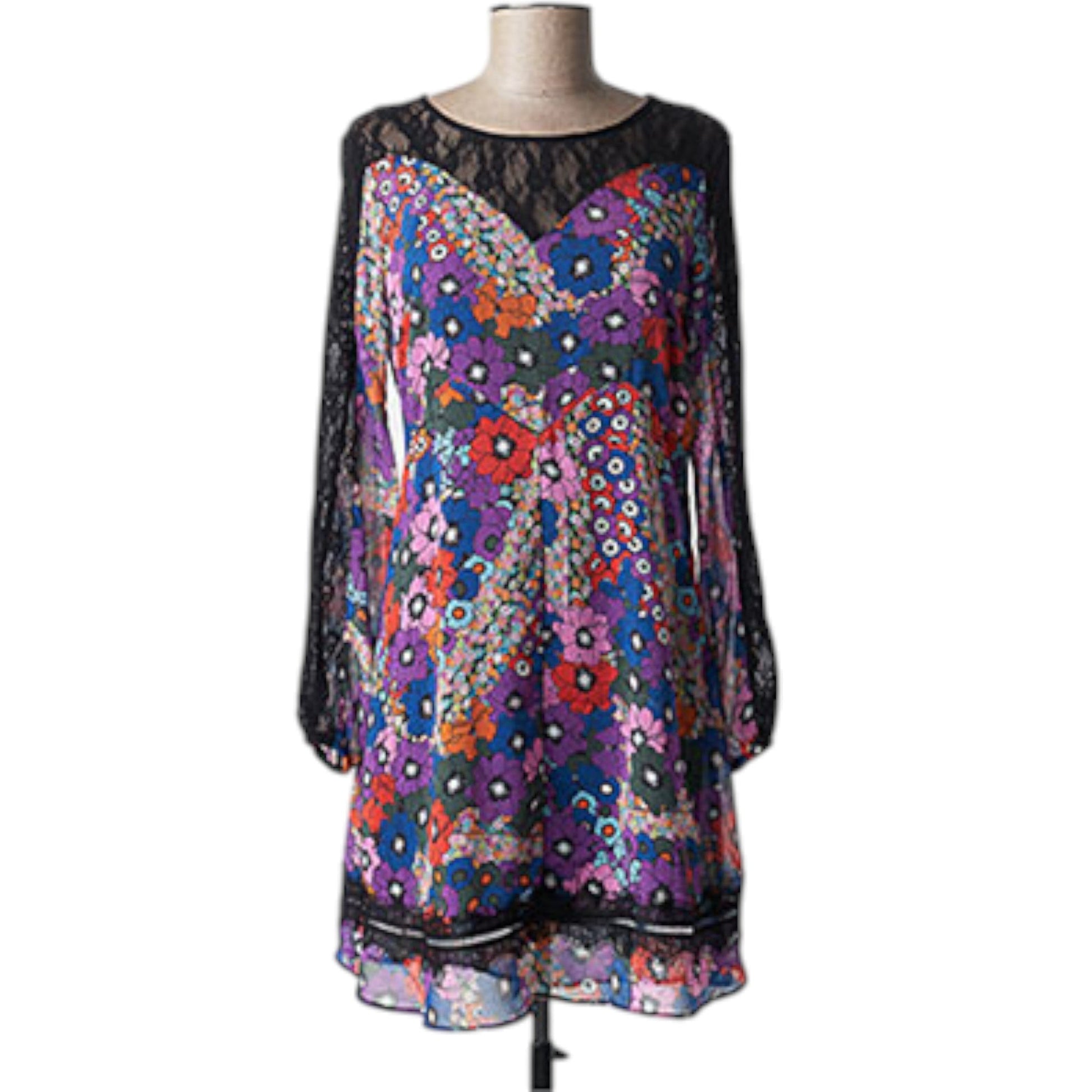 Címke nélküli, sokszínű, hosszú csipke ujjú, V-nyakú, virágmintás, csipke díszítéssel a nyakkivágásnál és az alján.
