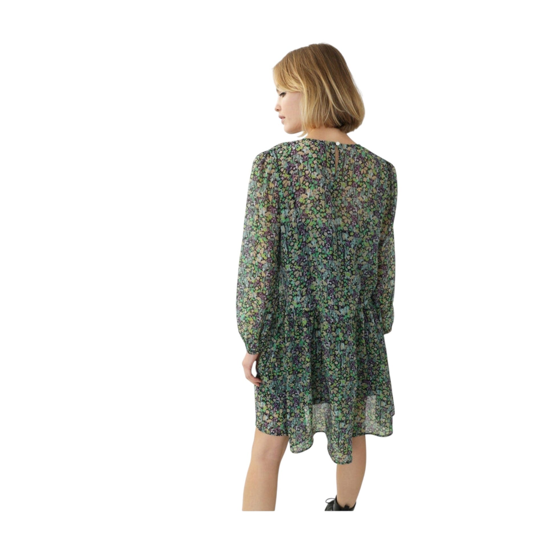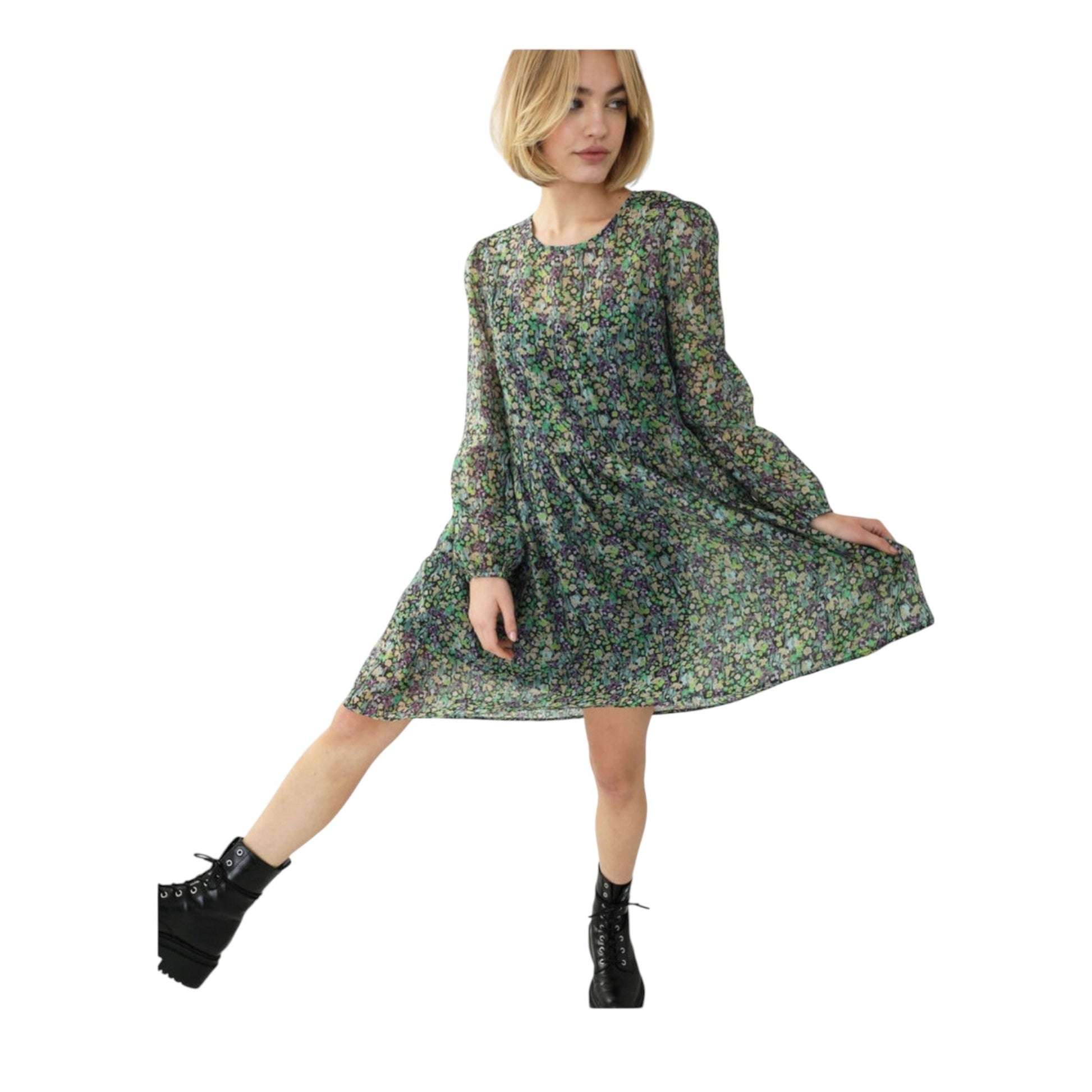 Címke nélküli, zöld alapon színes virágmintás, kerek nyakú, hosszú ujjú, átlátszó anyagszerű, bő szabású, rövid mini ruha.