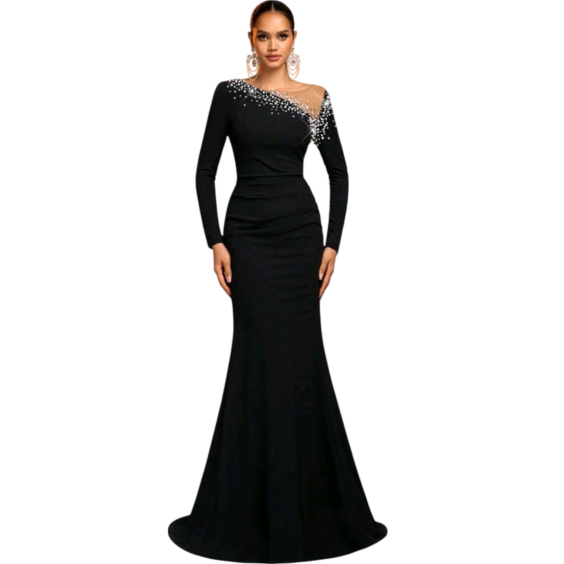 Címke nélküli, fekete, hosszú ujjú, strasszos felsőrésszel, sellő fazonú, hosszú estélyi ruha.