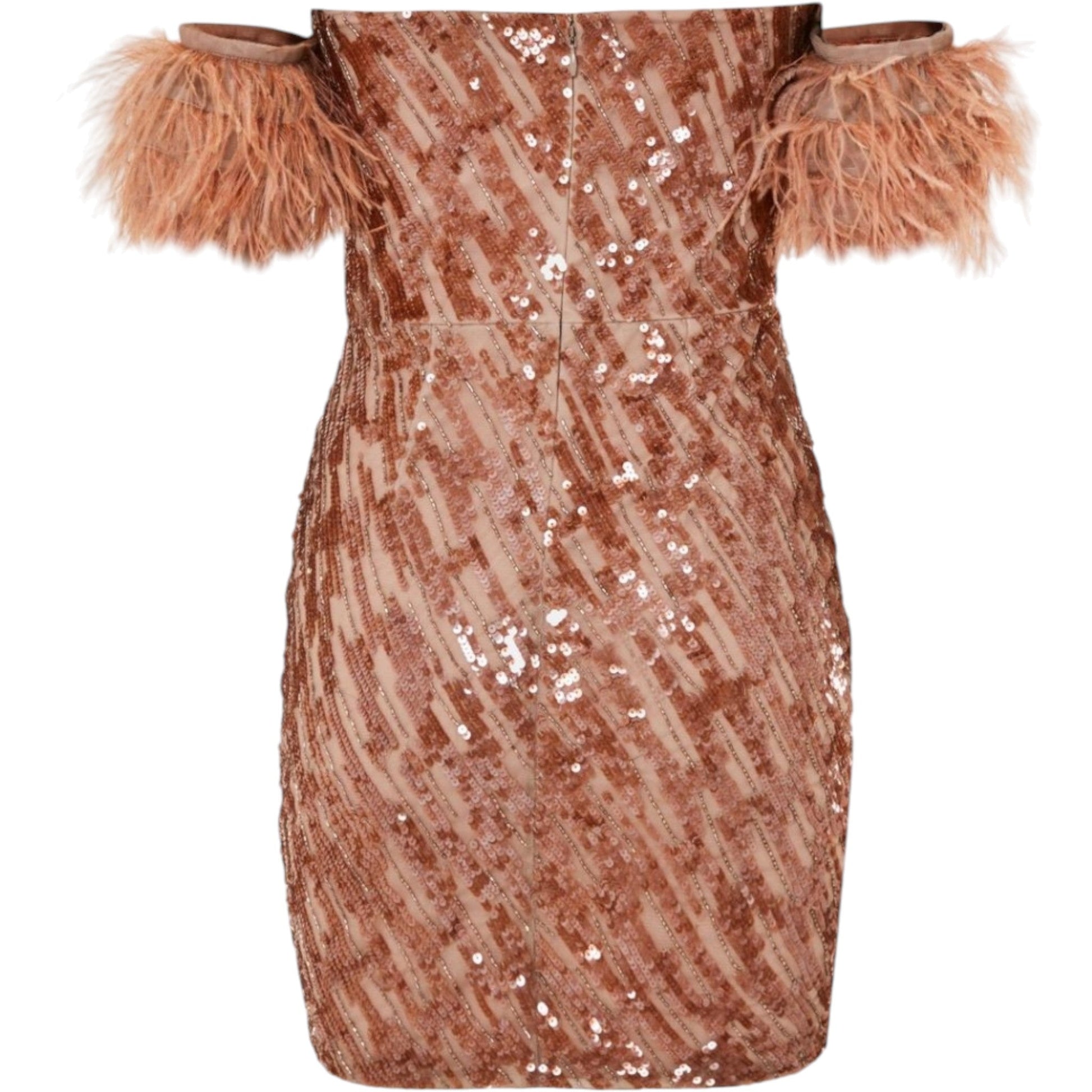 Címke nélküli, rózsaszín, pánt nélküli, flitterekkel díszített mini ruha, szűk szabású, tollas díszítéssel a karoknál (vállaknál).