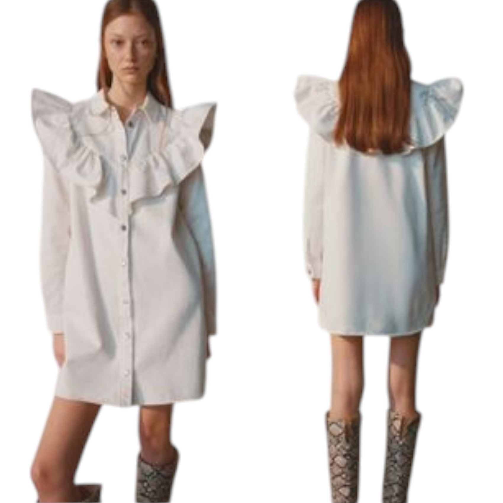 Címke nélküli, fehér, hosszú ujjú, galléros, gombos, fodros mellrészű ingruha.