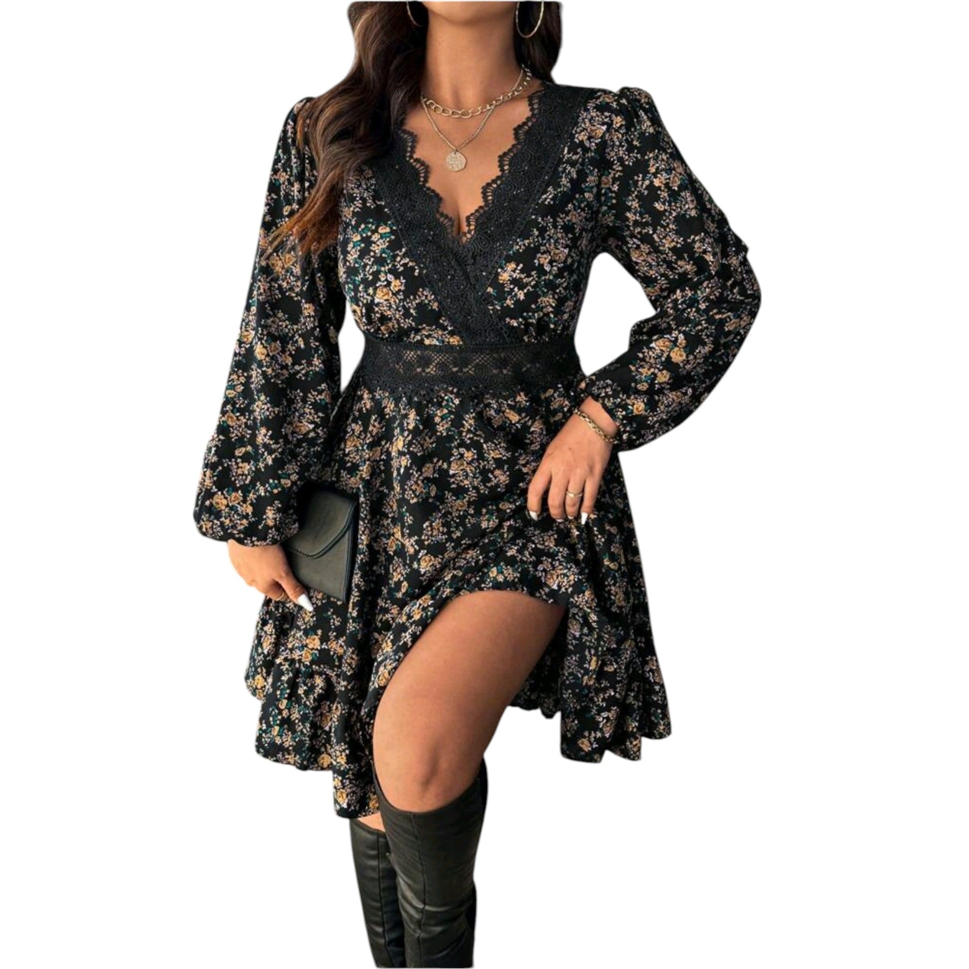 Címke nélküli, fekete, virágmintás, V-nyakú, csipkés díszítésű, hosszú ujjú, fodor aljú mini ruha.