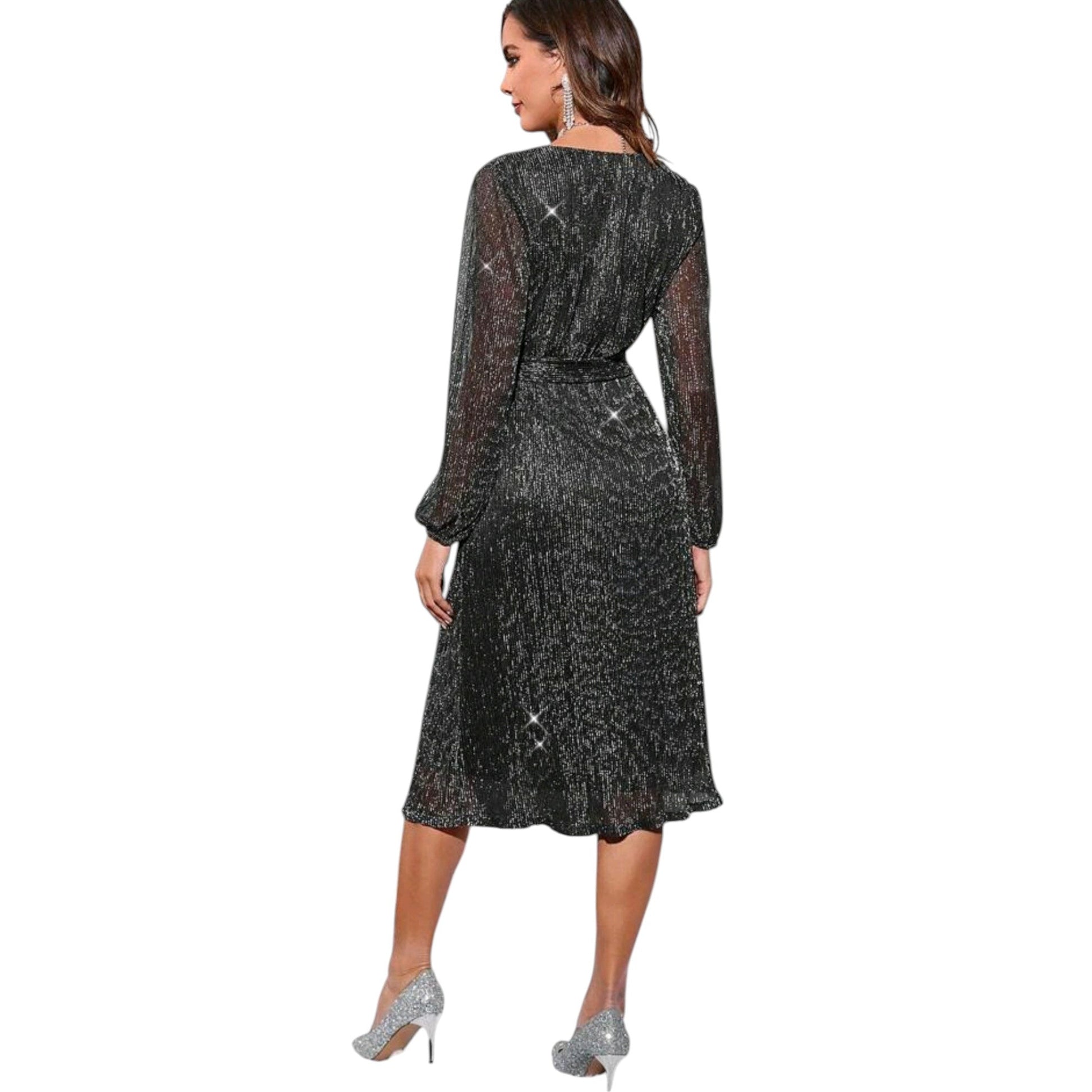 Címke nélküli, fekete, pillangó mintás, V-nyakú, rövid ujjú, megkötős derékkal, hosszú.